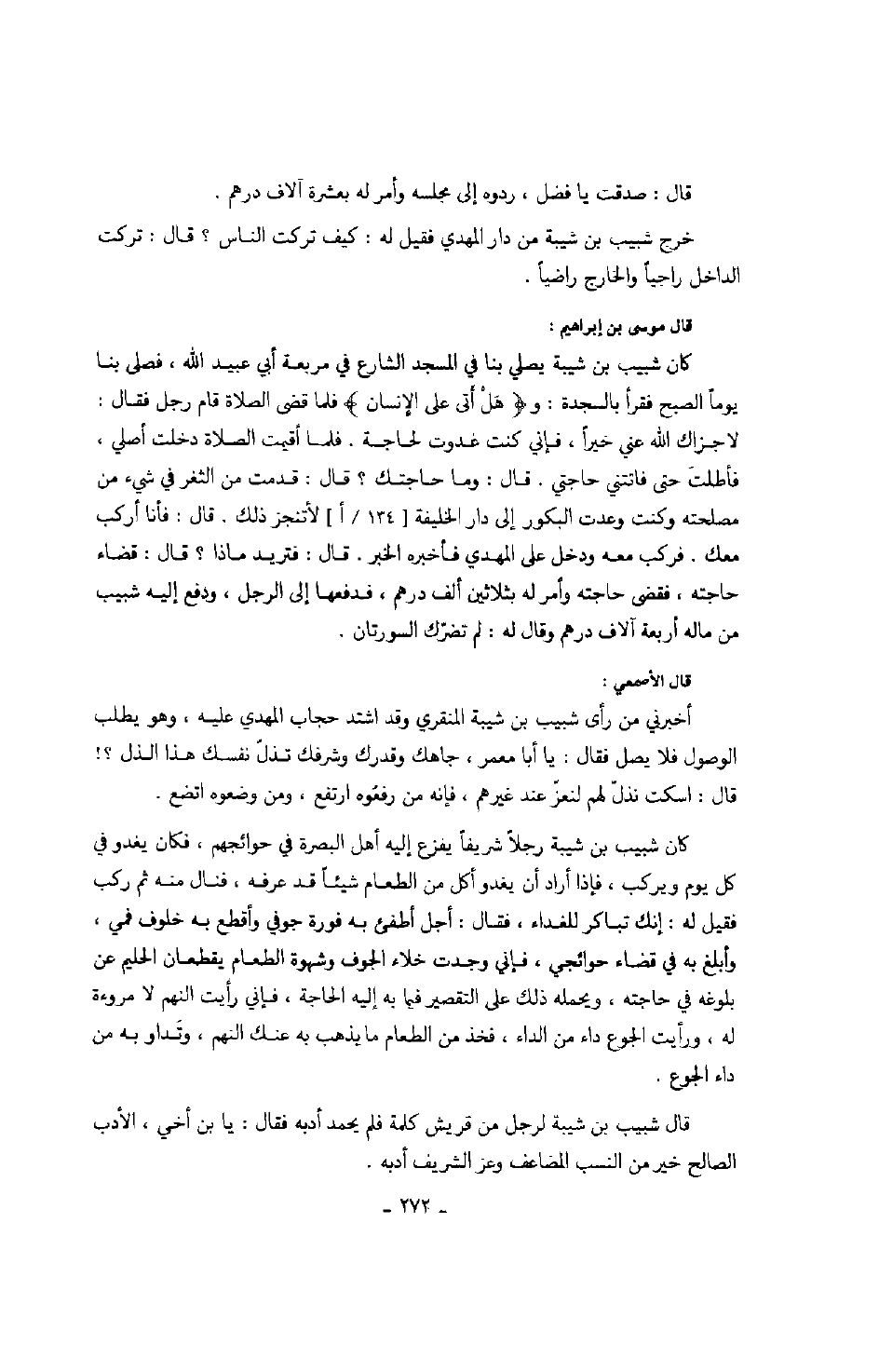 قال موسى بن إبراهيم: كان شبيب بن شيبة يصلي بنا في المسجد الشارع في مربعة أبي عبيد الله، فصلى بنا يوماً الصبح فقرأ بالسجدة: و" هل أتى على الإنسان " فلما قضى الصلاة قام رجل فقال: لا جزاك الله عني خيراً، فإني كنت غدوت لحاجة. فلما أقيمت الصلاة دخلت أصلي، فأطلت حتى فاتتني حاجتي. قال: وما حاجتك؟ قال: قدمت من الثغر في شيء من مصلحته وكنت وعدت البكور إلى دار الخليفة لأتنجز ذلك. قال: فأنا أركب معك. فركب معه ودخل على المهدي فأخبره الخبر. قال: فتريد ماذا؟ قال: قضاء حاجته، فقضى حاجته وأمر له بثلاثين ألف درهم، فدفعها إلى الرجل، ودفع إليه شبيب من ماله أربعة آلاف درهم قال له: لم تضرك السورتان.