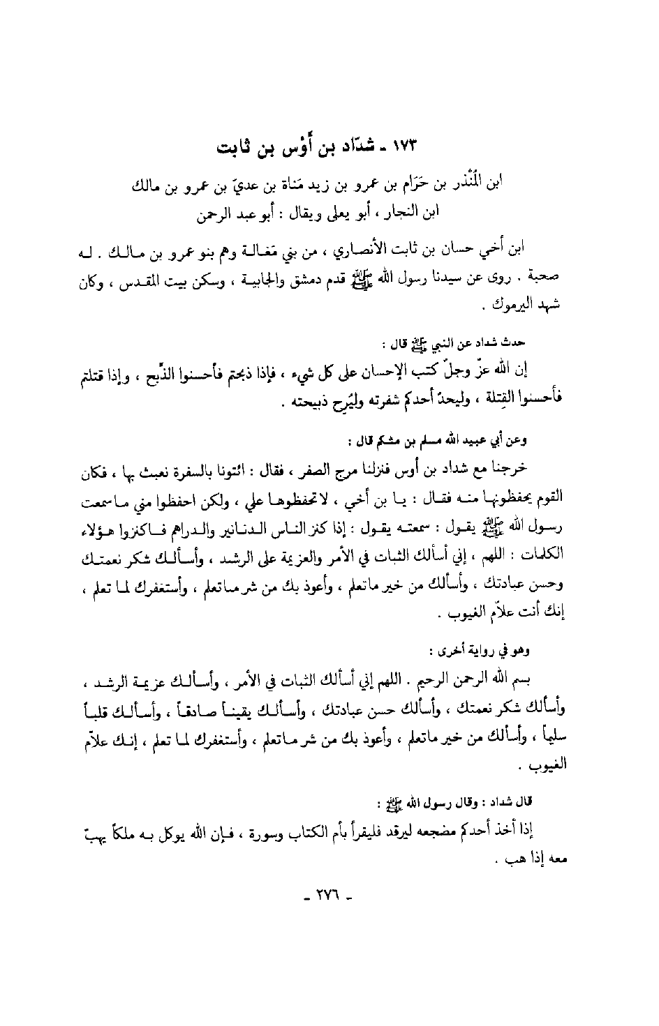 وعن أبي عبيد الله مسلم بن مشكم قال: خرجنا مع شداد بن أوس فنزلنا مرج الصفر، فقال: ائتونا بالسفرة نعبث بها فكان القوم يحفظونها منه فقال: يا بن أخي، لا تحفظوها علي، ولكن احفظوا مني ما سمعت رسول الله صَلَّى اللهُ عَلَيْهِ وَسَلَّمَ يقول: سمعته يقول: " إذا كنز الناس الدنانير والدراهم فاكنزوا هؤلاء الكلمات: اللهم أني أسألك الثبات في الأمر والعزيمة على الرشد، وأسألك شكر نعمتك وحسن عبادتك، وأسألك من خير ما تعلم، وأعوذ بك من شر ما تعلم، واستغفرك لما تعلم أنك أنت علام العيوب.