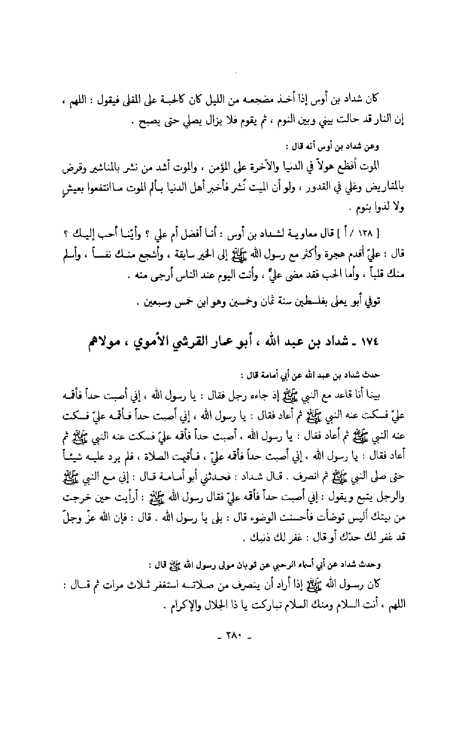 كان شداد بن أوس إذا أخذ مضجعه من الليل كان كالحبة على المقلى فيقول: اللهم، إن النار قد حالت بيني وبين النوم، ثم يقوم فلا يزال يصلي حتى يصبح.