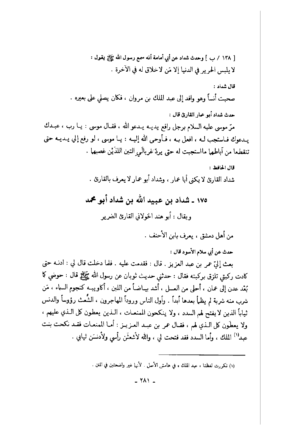 قال شداد: صحبت أنساً وهو وافد إلى عبد الملك بن مروان، فكان يصلي على بعيره، حدث شداد أبو عمار القارئ قال: مر موسى عليه السلام برجل رافع يديه يدعو الله، فقال موسى: يا رب، عبدك يدعوك فاستجب له، افعل به، فأوحى الله إليه: يا موسى، لو رفع إلي يديه حتى تنقطعا من آباطهما ما استجبت له حتى يرد غرباليّ اللتين الذين غصبهما.