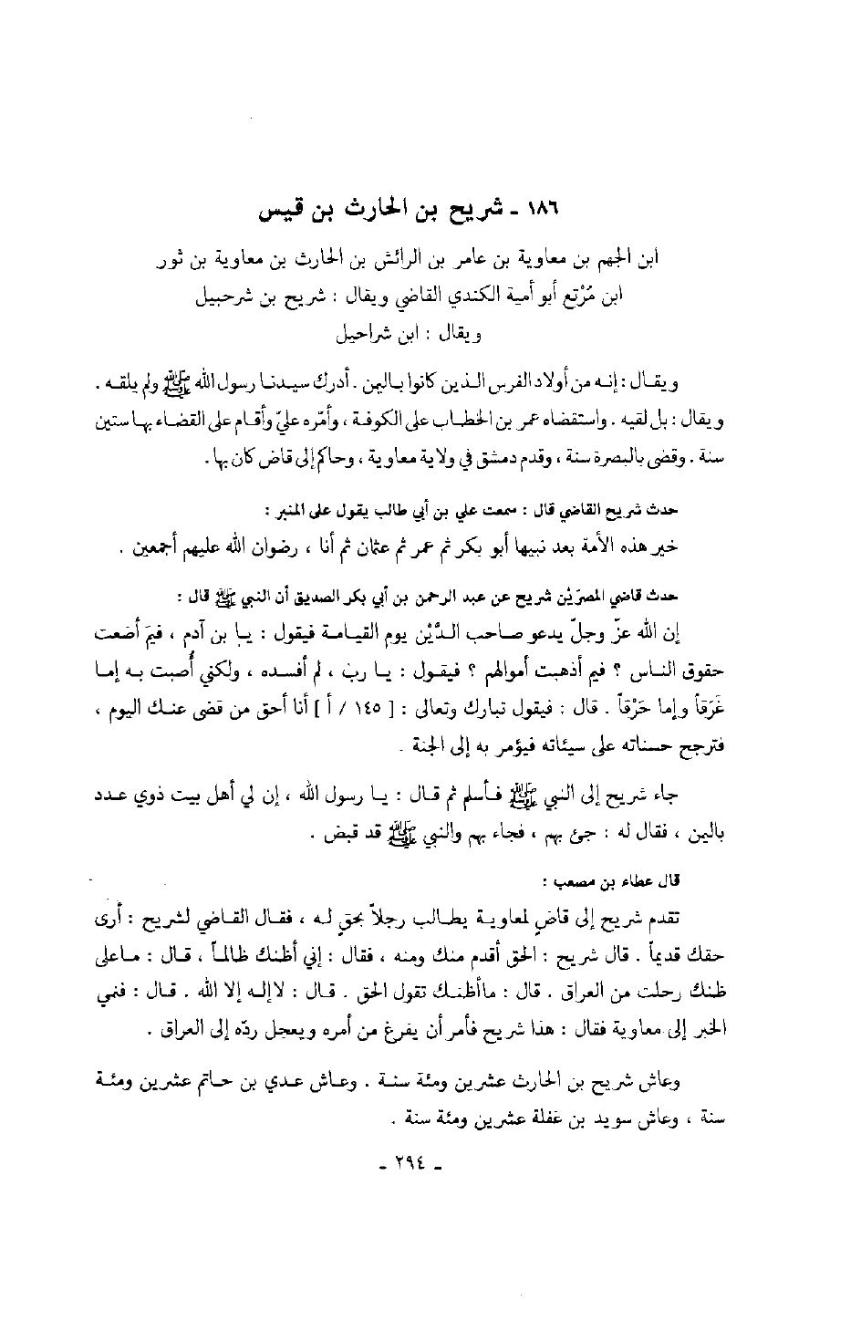 ويقال: إنه من أولاد الفرس الذين كانوا باليمن. أدرك سيدنا رسول الله صَلَّى اللهُ عَلَيْهِ وَسَلَّمَ ولم يلقه. ويقال: بل لقيه. واستقضاه عمر بن الخطاب على الكوفة، وأمّره علي وأقام على القضاء بها ستين سنة. وقضى بالبصرة سنة، وقدم دمشق في ولاية معاوية، وحاكم إلى قاض كان بها.