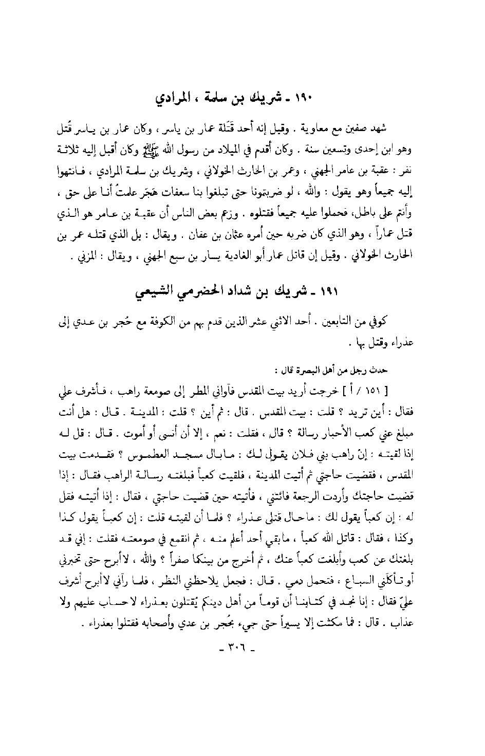خرجت أريد بيت المقدس فآواني المطر صومعة راهب، فأشرف عليّ فقال: أين تريد؟ قلت: بيت المقدس، قال: ثم أين؟ قلت: المدينة. قال: هل أنت مبلغ عني كعب الأحبار رسالة؟ قال، فقلت: نعم، إلا أن أنسى أو أموت. قال: قل له إذا لقيته: إنّ راهب بني فلان يقول لك: ما بال مسجد العطموس؟ فقدمت بيت المقدس، فقضيت حاجتي ثم أتيت المدينة، فلقيت كعباً فبلغته رسالة الراهب فقال: إذا قضيت حاجتك وأردت الرجعة فائتني، فأتيته حين قضيت حاجتي، فقال: إذا أتيته فقل له: إن كعباً يقول لك: ما حال قتلى عذراء؟ فلما أن لقيته قلت: إن باً يقول كذا وكذا، فقال: قاتل الله كعباً، ما بقي أحد أعلم منه، ثم انقمع في صومعته فقلت: إني قد بلغتك عن كعب وأبلغت كعباً عنك، ثم أخرج من بينكما صفراً؟ والله، لا أبرح حتى تخبرني أو تأكلني السباع، فتحمل دمي. قال: فجعل يلاحظني النظر، فلما رآني لا أبرح أشرف علي فقال: إنا نجد في كتابنا أن قوماً من أهل دينكم يقتلون بعذراء لا حساب عليهم ولا عذاب، قال: فما مكثت إلا يسيراَ حتى جيء بحجر بن عدي وأصحابه فقتلوا بعذراء.