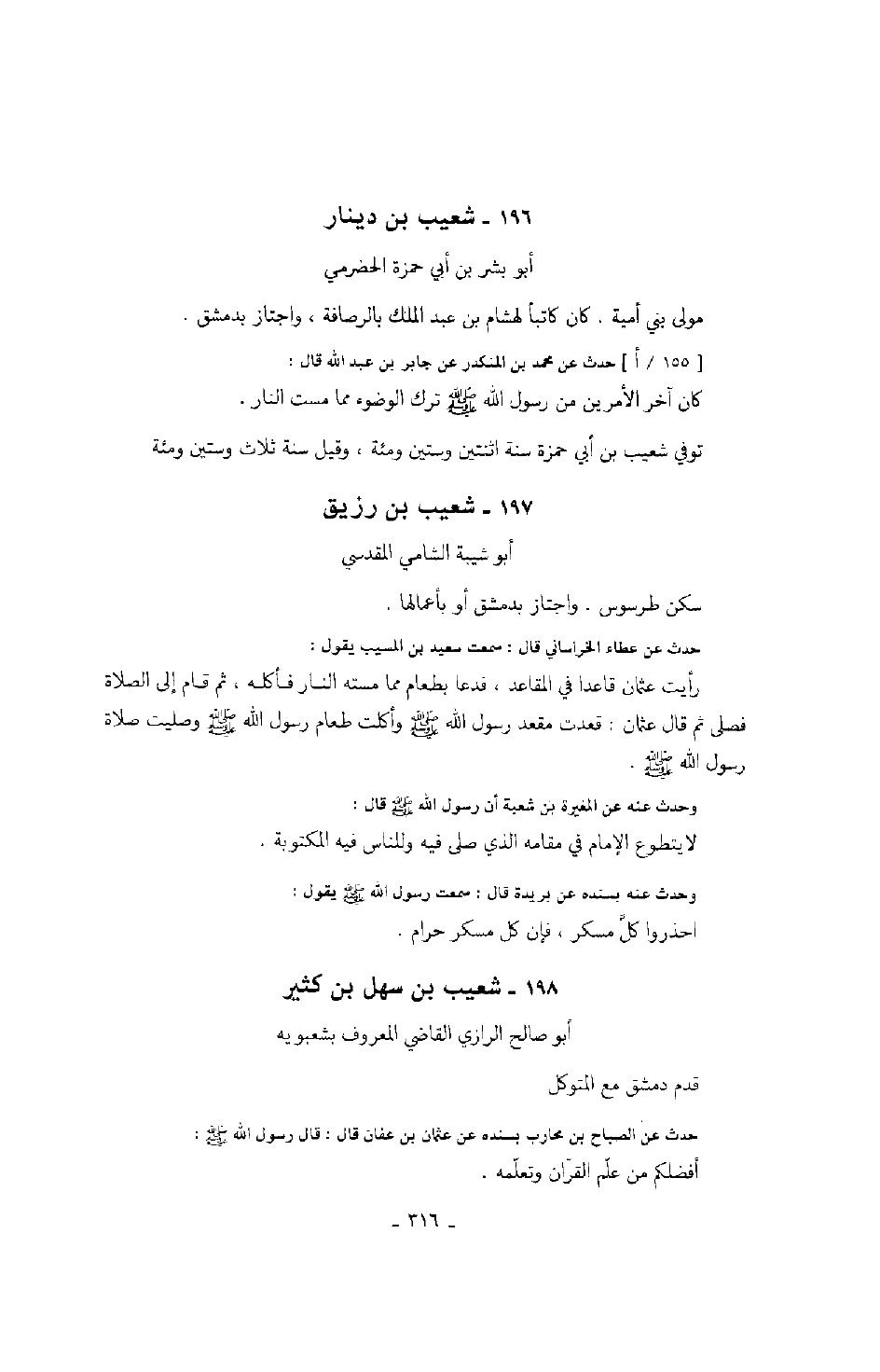 أبو صالح الرازي القاضي المعروف بشعبويه قدم دمشق مع المتوكل حدث عن الصباح بن محارب بسنده عن عثمان بن عفان قال: قال رسول الله صَلَّى اللهُ عَلَيْهِ وَسَلَّمَ: " أفضلكم من علم القرآن وتعلمه ".