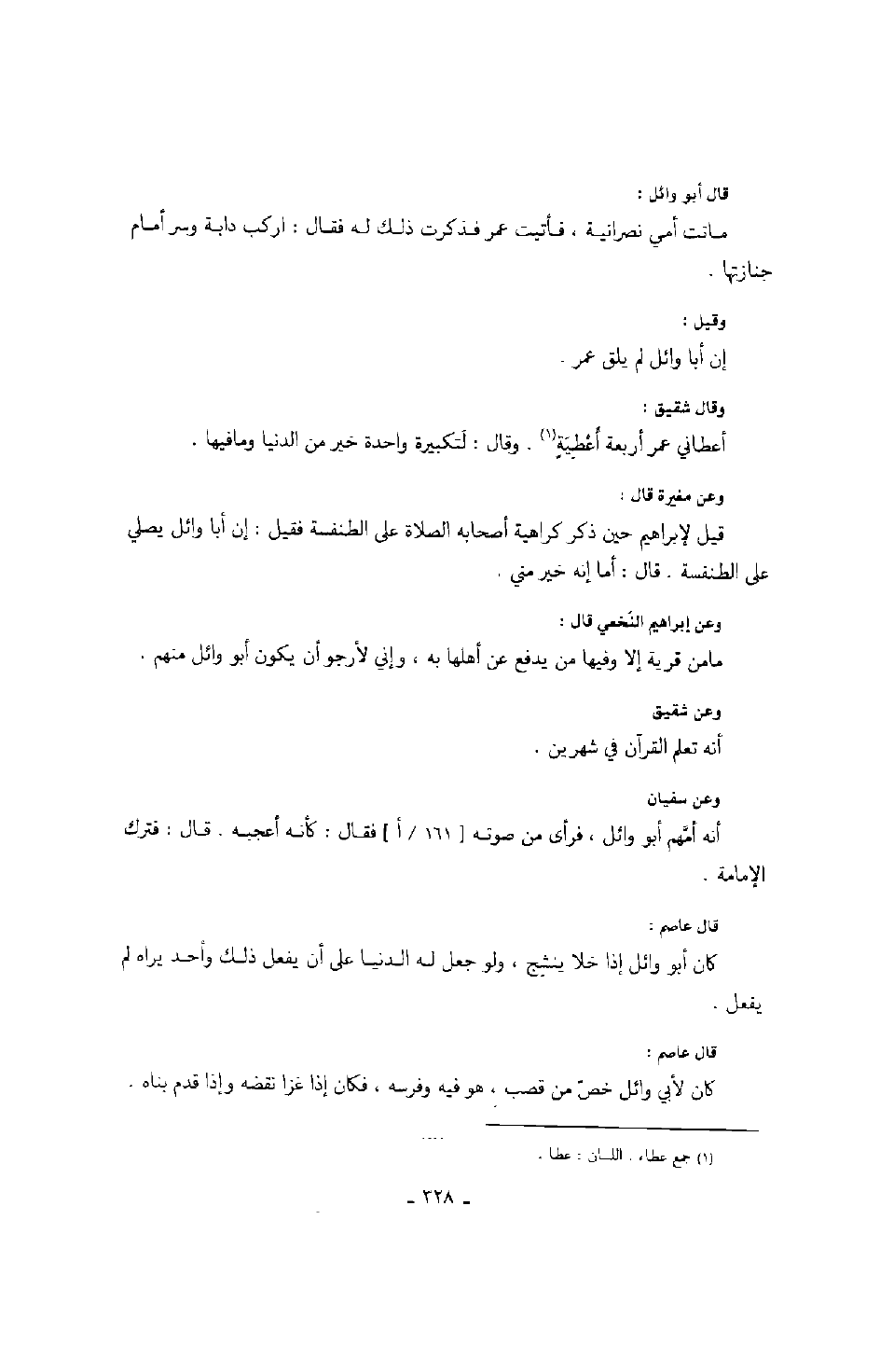 وقال شقيق: أعطاني عمر أربعة أعطية. وقال: لتكبيرة واحدة خير من الدنيا وما فيها.
