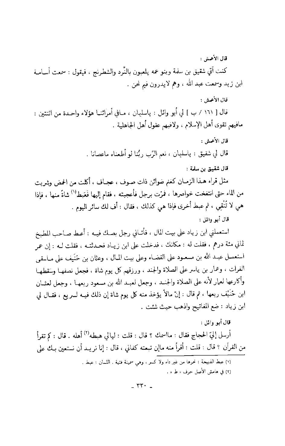 قال الأعمش: قال لي أبو وائل: يا سليمان، ما في أمرائنا هؤلاء واحدة من اثنتين: ما فيهم تقوى أهل الإسلام، ولا فيهم عقول أهل الجاهلية.