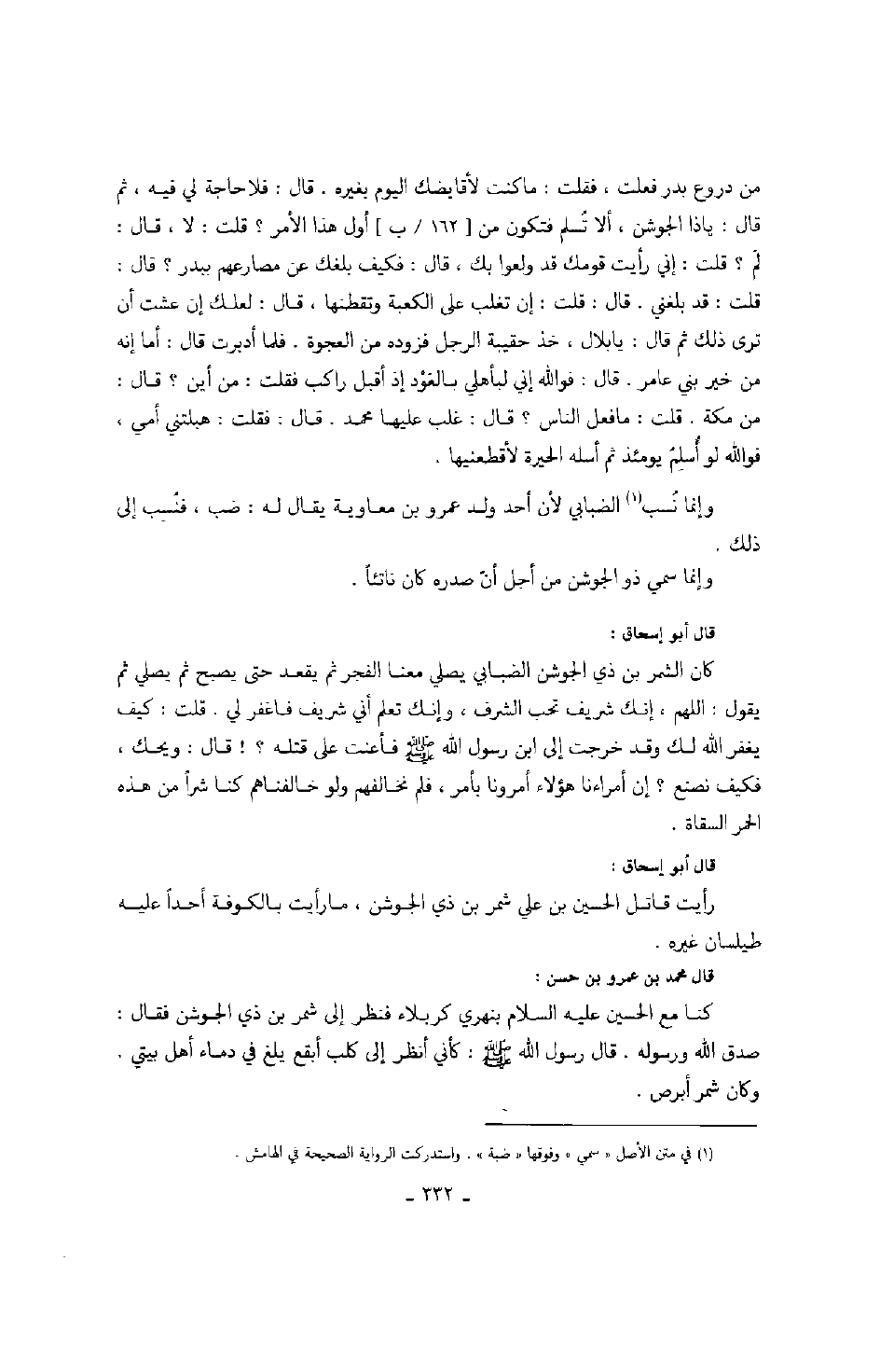 قال أبو إسحاق: كان الشمر بن ذي الجوشن الضبابي يصلي معنا الفجر ثم يقعد حتى يصبح ثم يصلي ثم يقول: اللهم، إنك شريف تحب الشرف، وإنك تعلم أني شريف فاغفر لي. قلت: كيف يغفر الله لك وقد خرجت إلى ابن رسول الله صَلَّى اللهُ عَلَيْهِ وَسَلَّمَ فأعنت على قتله؟! قال: ويحك، فكيف نصنع؟ إن أمراءنا هؤلاء أمرونا بأمر، فلم نخالفهم ولو خالفناهم كنا شراً من هذه الحمر السقاة.