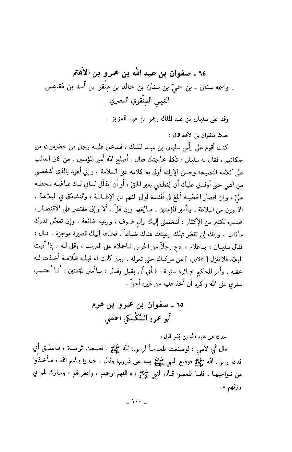 كنت أقوم على رأس سليمان بن عبد الملك، فدخل عليه رجل من حضرموت من حكمائهم، فقال له سليمان: تكلم بحاجتك فقال: أصلح الله أمير المؤمنين. من كان الغالب على كلامه النصيحة وحسن الإرادة أوفى به كلامه على السلامة، وإني أعوذ بالذي أشخصني من أهلي حتى أوفدني عليك أن يُنطقني بغير الحقّ، أو أن يذلّل لساني لك بما فيه سخطه عليّ، وإن إقصار الخطبة أبلغ في أفئدة أولي الفهم من الإطالة، والتشدّق في البلاغة. ألا وأن من البلاغة - يا أمير المؤمنين - ما يفهم وإن قلّ. ألا وإني مقتصر على الاقتصار، مجتنب لكثير من الإكثار: أشخصني إليك والٍ عَسوف، ورعية ضائعة. وإن تعجِّل تدرك ما فات، وإنك إن تقصّر تهلك رعيتك هناك ضياعاً. فخذها إليك قصيرة موجزة. قال: فقال سليمان: يا غلام، ادع رجلاً من الحرس فاحملاه على البريد، وقل له: إذا أتيت البلاد فلا تنزل من مركبك حتى تعزله. ومن كانت له قبله ظُلامة أخذت له بحقه، وأمر للحكيم بجائزة سنية. فأبى أن يقبل وقال: يا أمير المؤمنين، أنا أحتسب سفري على الله وأكره أن آخذ عليه من غيره أجراً.