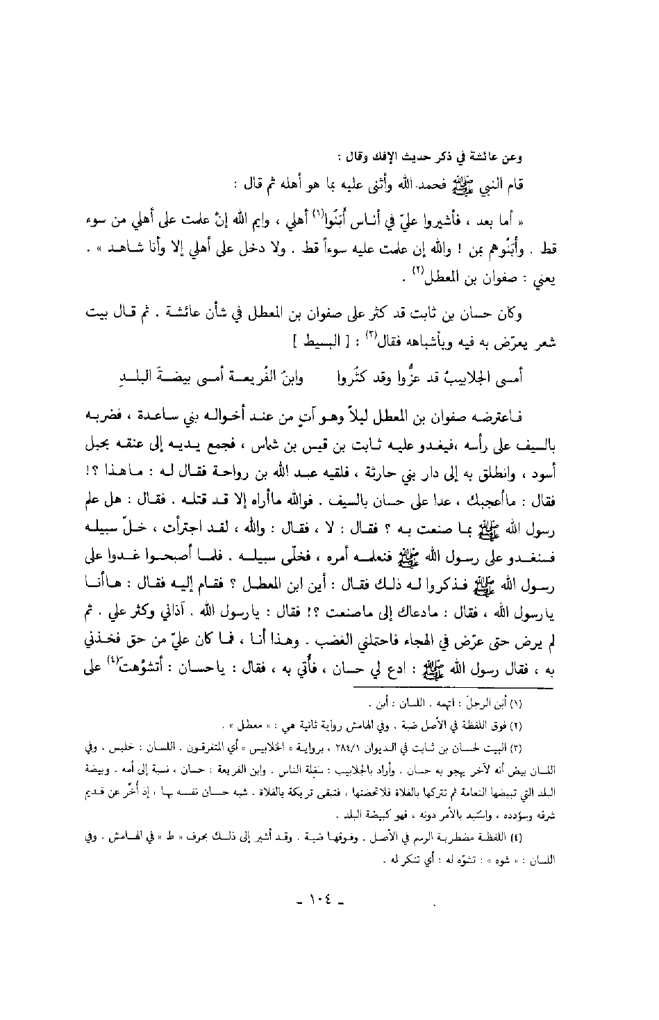 وعن عائشة في ذكر حديث الإفك وقال: قام النبي صَلَّى اللهُ عَلَيْهِ وَسَلَّمَ فحمد الله وأثنى عليه بما هو أهله ثم قال: " أما بعد، فأشيروا عليّ في أناس أَبَنُوا أهلي، وايم الله إن علمت على أهلي من سوء قط. وأَبَنُوهم بمن! والله إن علمت عليه سوءاً قط. ولا دخل على أهلي إلا وأنا شاهد ". يعني: صفوان بن المعطل.