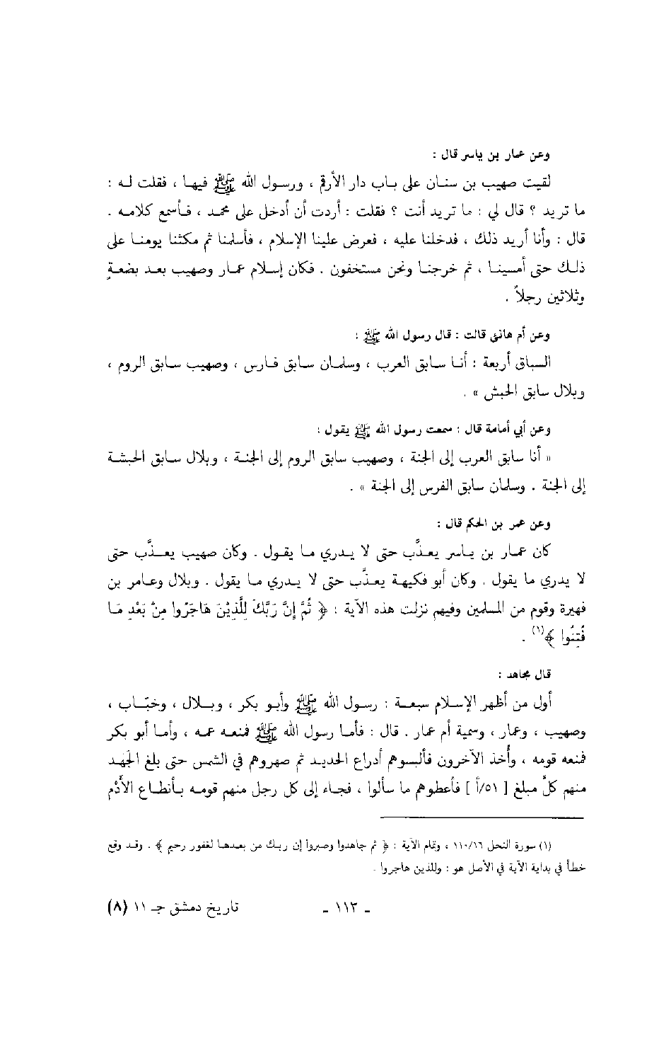 وعن عمر بن الحكم قال: كان عمار بن ياسر يعذَّب حتى لا يدري ما يقول. وكان صهيب يعذَّب حتى لا يدري ما يقول. وكان أبو فكيهة يعذَّب حتى لا يدري ما يقول. وبلال وعامر بن فهيرة وقوم من المسلمين وفيهم نزلت هذه الآية: " ثُمَّ إِنَّ رَبَّكَ لِلَّذِيْنَ هَاجَرُوا مِنْ بَعْدِ مَا فُتِنُوا ".