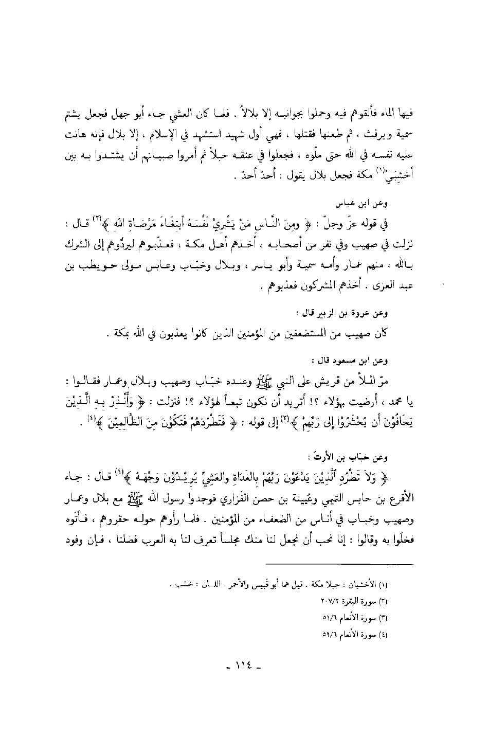 وعن ابن مسعود قال: مرَ الملأ من قريش على النبي صَلَّى اللهُ عَلَيْهِ وَسَلَّمَ وعنده خبّاب وصهيب وبلال وعمار فقالوا: يا محمد، أرضيت بهؤلاء؟! أتريد أن نكون تبعاً لهؤلاء؟! فنزلت: " وَأَنْذِرْ بِهِ الَّذِينَ يَخَافُونَ أن يَحْشَرُوْا إلى رَبِّهِمْ " إلى قوله: " فَتَطْرُدَهُمْ فَتَكُوْنَ مِنَ الظَّالِمِيْنَ ".