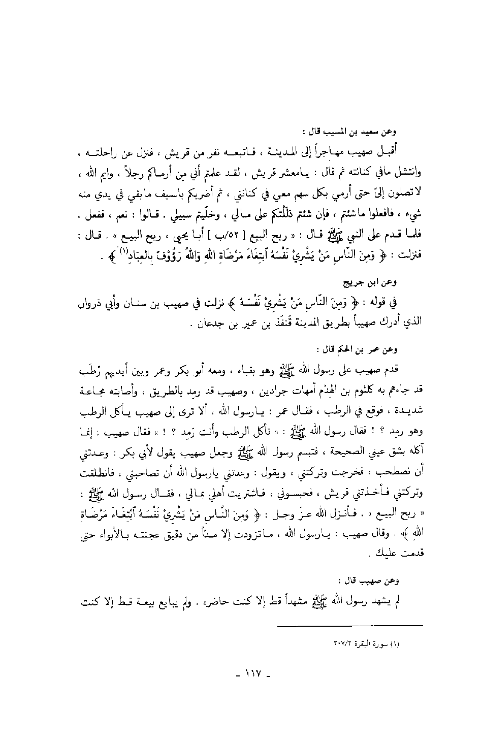 وعن سعيد بن المسيب قال: أقبل صهيب مهاجراً إلى المدينة، فاتبعه نفر من قريش، فنزل عن راحلته، وانتشل ما في كنانته ثم قال: يا معشر قريش، لقد علمتم أني من أرماكم رجلاً، وأيم الله، لا تصلون إلى حتى أرمي بكل سهم معي في كنانتي، ثم أضربكم بالسيف ما بقي في يدي منه شيء، فافعلوا ما شئتم، فإن شئتم دَلَلْتكم على مالي، وخلَيتم سبيلي. قالوا: نعم، ففعل. فلما قدم على النبي صَلَّى اللهُ عَلَيْهِ وَسَلَّمَ قال: " ربح البيع أبا يحيى، ربح البيع ". قال: فنزلت: " وَمِنَ النّاسِ مَنْ يَشْرِيْ ابتغَاءَ مَرْضَاةِ اللهِ واللهُ رَؤُوْفٌ بِالعِبَادِ ".