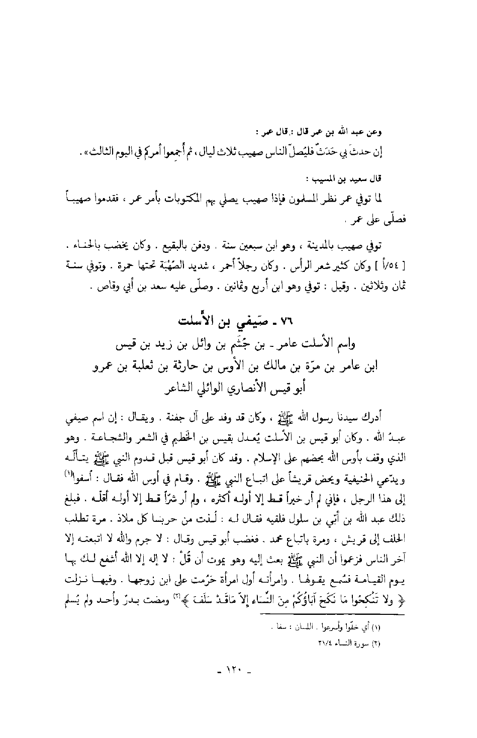 أدرك سيدنا رسول الله صَلَّى اللهُ عَلَيْهِ وَسَلَّمَ، وكان قد وفد على آل جفنة. ويقال: إن اسم صيفي عبدُ الله. وكان أبو قيس بن الأسلت يُعدل بقيس بن الخطيم في الشعر والشجاعة. وهو الذي وقف بأوس الله يحضهم على الإسلام. وقد كان أبو قيس قبل قدوم النبي صَلَّى اللهُ عَلَيْهِ وَسَلَّمَ يتألّه ويدّعى الحنيفية ويحض قريشاً على اتباع النبي صَلَّى اللهُ عَلَيْهِ وَسَلَّمَ. وقام في أوس الله فقال: أسفوا إلى هذا الرجل، فإني لم أر خيراً قط إلا أوله أكثره، ولم أرد شرّاً قط إلا أوله أكثره، ولم أر شرّاً قط إلا أوله أقلّه. فبلغ ذلك عبد الله بن أبي بن سلول فلقيه فقال له: لُذت من حربنا كل ملاذ. مرة تطلب الحلف إلى قريش، ومرة باتباع محمد. فغضب أبو قيس وقال: لا جرم والله لا اتبعته إلا آخر الناس فزعموا أن النبي صَلَّى اللهُ عَلَيْهِ وَسَلَّمَ بعث إليه وهو يموت أن قُلْ: لا إله إلا الله أشفع لك بها يوم القيامة فسُمع يقولها. وامرأته أول امرأة حَرُمت على ابن زوجها. وفيها نزلت " ولا تَنْكِحُوا مَا نَكَحَ آبَاؤُكُمْ مِنَ النِّسَاءِ إلاَّ ما قَدْ سَلَفَ " ومضت بدرٌ وأحد ولم يُسلم