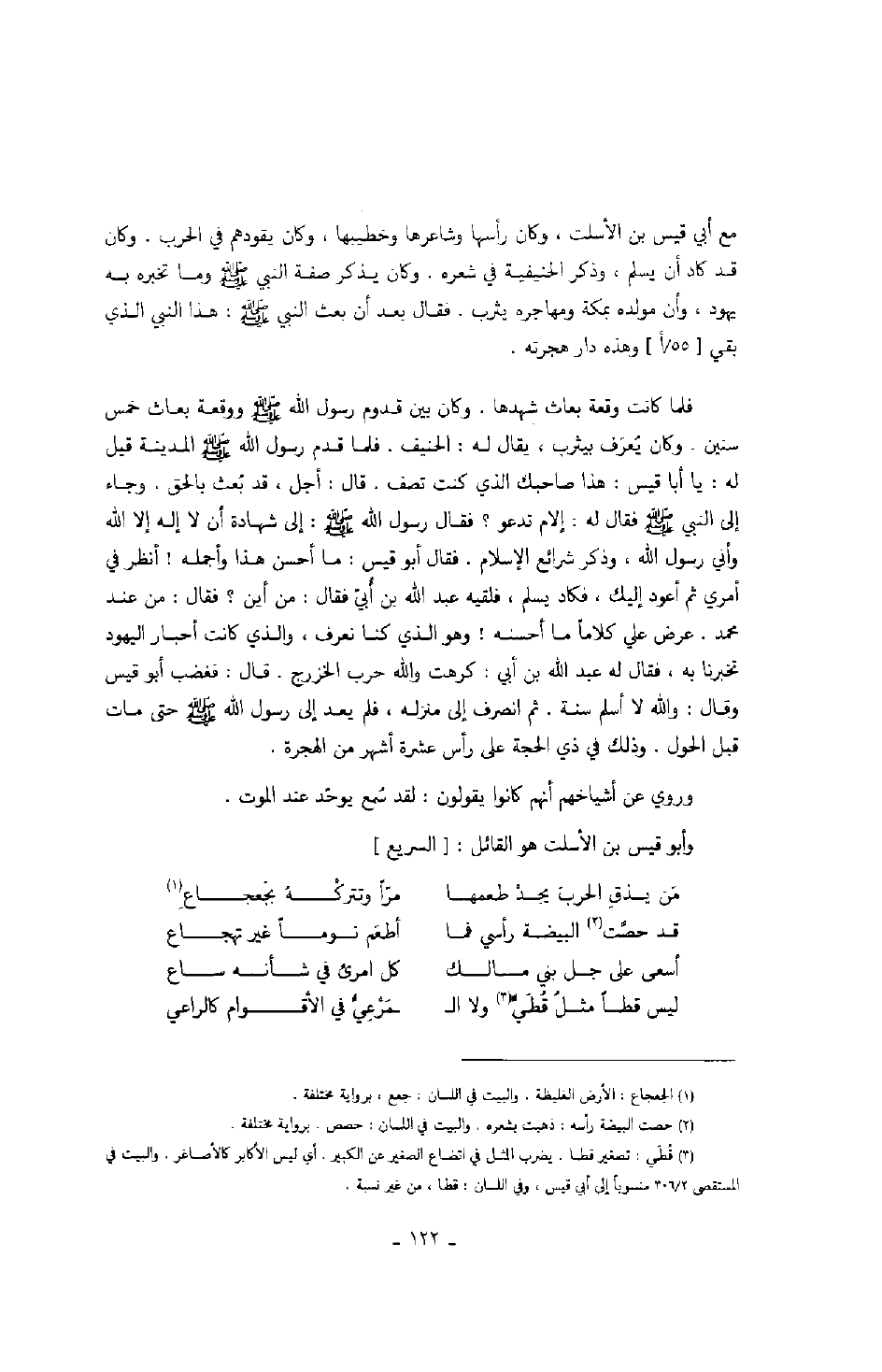 فلما كانت وقعة بعاث شهدها. وكان بين قدوم رسول الله صَلَّى اللهُ عَلَيْهِ وَسَلَّمَ ووقعة بعاث خمس سنين. وكان يُعرَف بيثرب، يقال له الحنيف. فلما قدم رسول الله صَلَّى اللهُ عَلَيْهِ وَسَلَّمَ المدينة قيل له: يا أبا قيس: هذا صاحبك الذي كنت تصف. قال: أجل، قد بُعث بالحق. وجاء إلى النبي صَلَّى اللهُ عَلَيْهِ وَسَلَّمَ فقال له: إلام تدعو؟ فقال رسول الله صَلَّى اللهُ عَلَيْهِ وَسَلَّمَ: إلى شهادة أن لا إله إلا الله وأني رسول الله، وذكر شرائع الإسلام. فقال أبو قيس: ما أحسن هذا وما أجمله! أنظر في أمري ثم أعود إليك، فكاد يسلم، فلقيه عبد الله بن أُبيّ فقال: من أين؟ فقال: من عند محمد. عرض علي كلاماً ما أحسنه! وهو الذي كنا نعرف، والذي كانت أحبار اليهود تخبرنا به، فقال له عبد الله بن أبي: كرهت والله حرب الخزرج. قال: فغضب أبو قيس وقال: والله لا أسلم سنة. ثم أنصرف إلى منزله، فلم يعد إلى رسول الله صَلَّى اللهُ عَلَيْهِ وَسَلَّمَ حتى مات قبل الحول. وذلك في ذي الحجة على رأس عشرة أشهر من الهجرة.