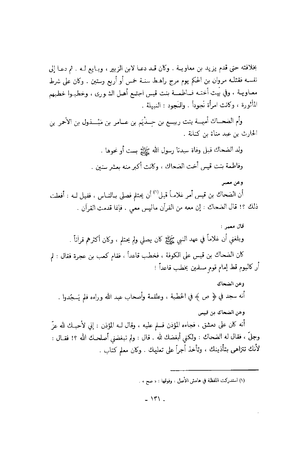 بخلافته حتى قدم يزيد بن معاوية. وكان قد دعا لابن الزبير، وبايع له. ثم دعا إلى نفسه فقتله مروان بن الحكم يوم مرج راهط سنة خمس أو أربع وستين. وكان على شرط معاوية، وفي بيت أخته فاطمة بنت قيس اجتماع أهل الشورى، وخطبوا خطبهم المأثورة، وكانت امرأة نجوداً. والنَجود: النبيلة.