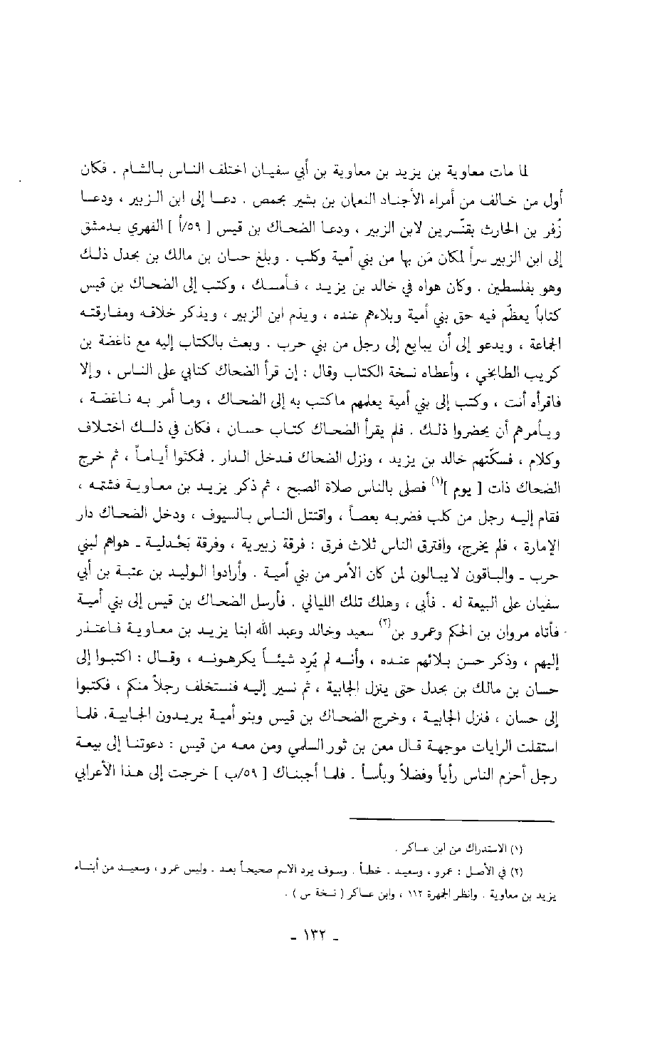 لما مات معاوية بن يزيد بن معاوية بن أبي سفيان اختلف الناس بالشام. فكان أول من خالف من أمراء الأجناد النعمان بن بشير بحمص. دعا إلى ابن الزبير، ودعا زُفر بن الحارث بقنسرين لابن الزبير، ودعا الضحاك بن قيس الفهري بدمشق إلى ابن الزبير سراً لمكان من بها من بني أمية وكلب. وبلغ حسان بن مالك بن بحدل ذلك وهو بفلسطين. وكان هواه في خالد بن يزيد، فأمسك، وكتب إلى الضحاك بن قيس كتاباً يعظّم فيه حق بني أمية وبلاءهم عنده، ويذم ابن الزبير، ويذكر خلافه ومفارقته الجماعة، ويدعوا إلى أن يبايع إلى الرجل من بني حرب. وبعث بالكتاب إليه مع ناغضة بن كريب الطابخي، وأعطاه نسخة الكتاب وقال: إن قرأ الضحاك كتابي على الناس، وإلا فاقرأه أنت، وكتب إلى بني أمية يعلمهم ما كتب به إلى الضحاك، وما أمر به ناغضة، ويأمرهم أن يحضروا ذلك. فلم يقرأ الضحاك كتاب حسان، فكان في ذلك اختلاف وكلام، فسكّتهم خالد بن يزيد، ونزل الضحاك فدخل الدار. فمكثوا أياماً، ثم خرج الضحاك ذات " يوم " فصلى بالناس صلاة الصبح، ثم ذكر يزيد بن معاوية فشتمه، فقام إليه رجل من كلب فضربه بعصاً، واقتتل الناس بالسيوف، ودخل الضحاك دار الإمارة، فلم يخرج، وافترق الناس ثلاث فرق: فرقة زبيرية، وفرقة بَحْدلية - هواهم لبني حرب - والباقون لا يبالون لمن كان الأمر من بني أمية. وأرادوا الوليد بن عتبة بن أبي سفيان على البيعة له. فأبى، وهلك تلك الليالي. فأرسل الضحاك بين قيس إلى بني أمية فأتاه مروان بن الحكم وعمرو بن سعيد وخالد وعبد الله ابنا يزيد بن معاوية فاعتذر إليهم، وذكر حسن بلائهم عنده، وأنه لم يُرِد شيئاً يكرهونه، وقال: اكتبوا إلى حسان بن مالك بن بحدل حتى ينزل الجابية، ثم نسير إليه فنستخلف رجلاً منكم، فكتبوا إلى حسان، فنزل الجابية، وخرج الضحاك بن قيس وبنوا أمية يريدون الجابية. فلما استقلت الرايات موجهة قال معن بن ثور السلمي ومن معه من قيس دعوتنا إلى بيعة رجل أحزم الناس رأياً وفضلاً وبأساً. فلما أجبناك خرجت إلى هذا الأعرابي