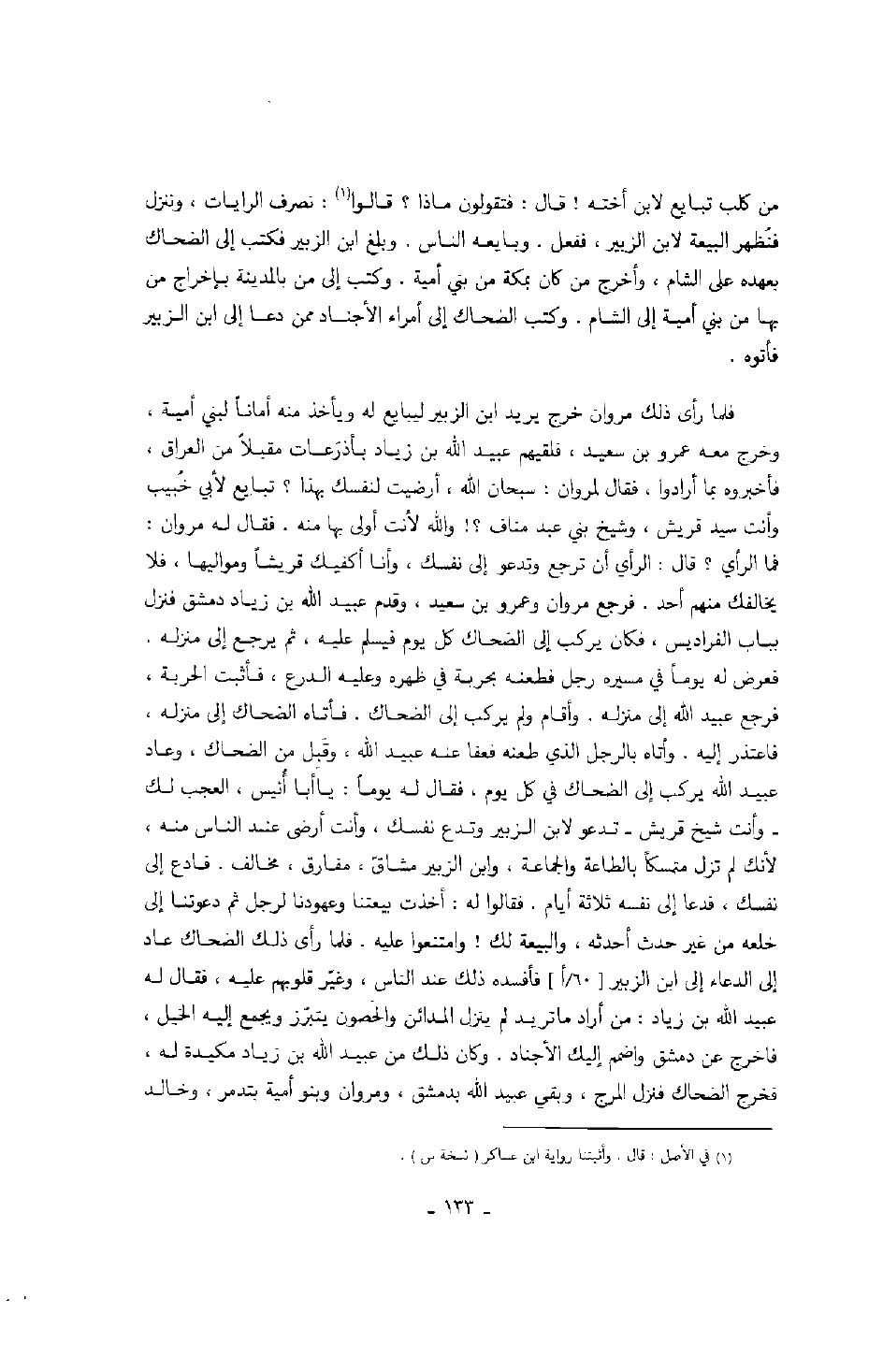 من كلب تبايع لابن أخته! قال: فتقولون ماذا؟ قالوا: نصرف الرايات، وننزل فنُظهر البيعة لابن الزبير، ففعل. وبايعه الناس. وبلغ ابن الزبير فكتب إلى الضحاك بعهده على الشام، وأخرج من كان بمكة من بني أمية. وكتب إلى من بالمدينة بإخراج من بها من بني أمية إلى الشام. وكتب الضحاك إلى أمراء الأجناد ممن دعا إلى ابن الزبير فأتوه.