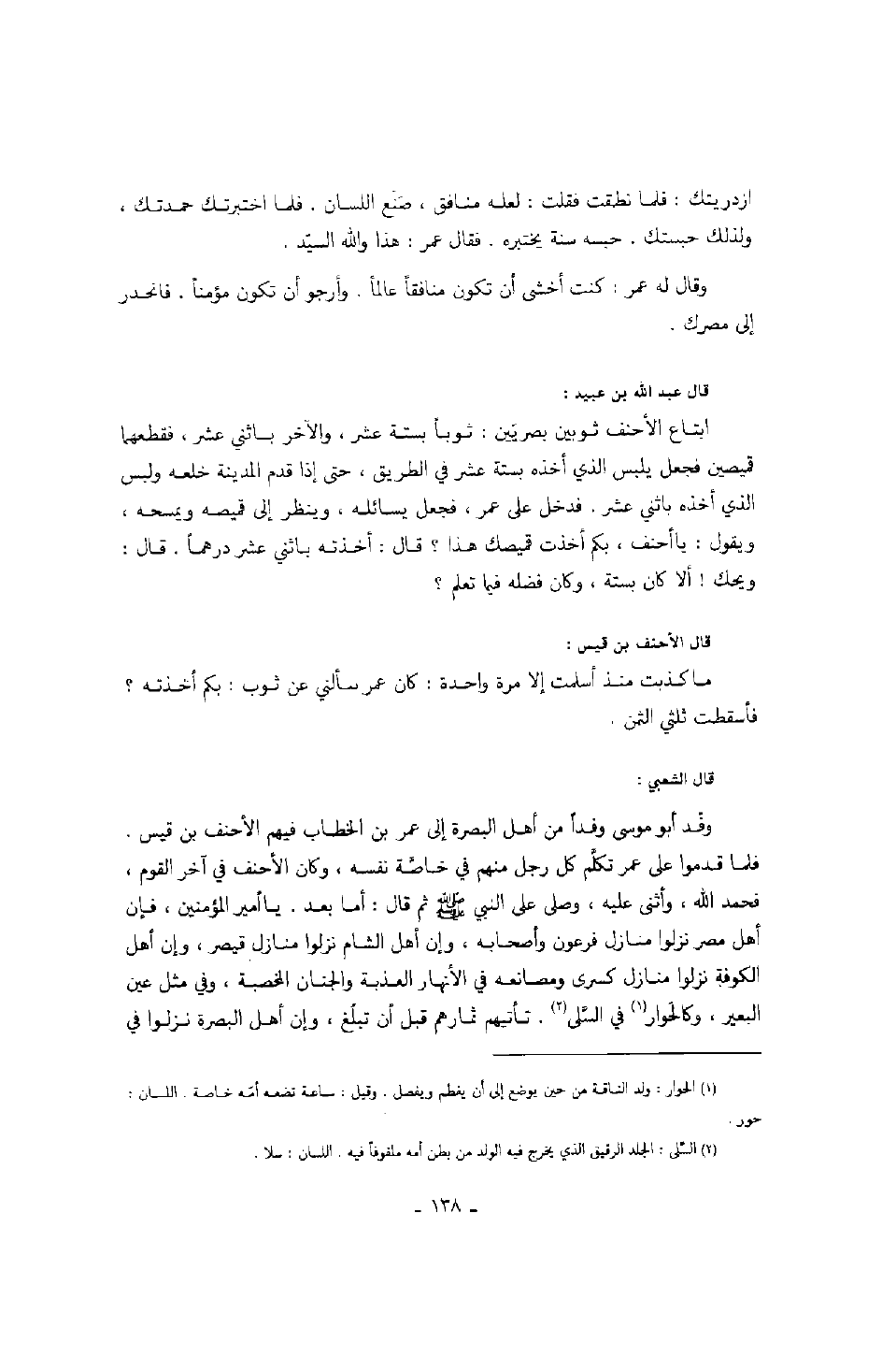 قال عبد الله بن عبيد: ابتاع الأحنف ثوبين بصريَين: ثوباً بستة عشر، والآخر باثني عشر، فقطعهما قميصين فجعل يلبس الذي أخذه بستة عشر في الطريق، حتى إذا قدم المدينة خلعه ولبس الذي أخذه باثني عشر. فدخل على عمر، فجعل يسائله، وينظر إلى قميصه ويمسحه، ويقول: يا أحنف، بكم أخذت قميصك هذا؟ قال: أخذته باثني عشر درهماً. قال: ويحك! ألا كان بستة، وكان فضله فيما تعلم؟ قال الأحنف بن قيس: ما كذبت منذ أسلمت لا مرة واحدة: كان عمر سألني عن ثوب: بكم أخذته؟ فأسقطت ثلث الثمن.