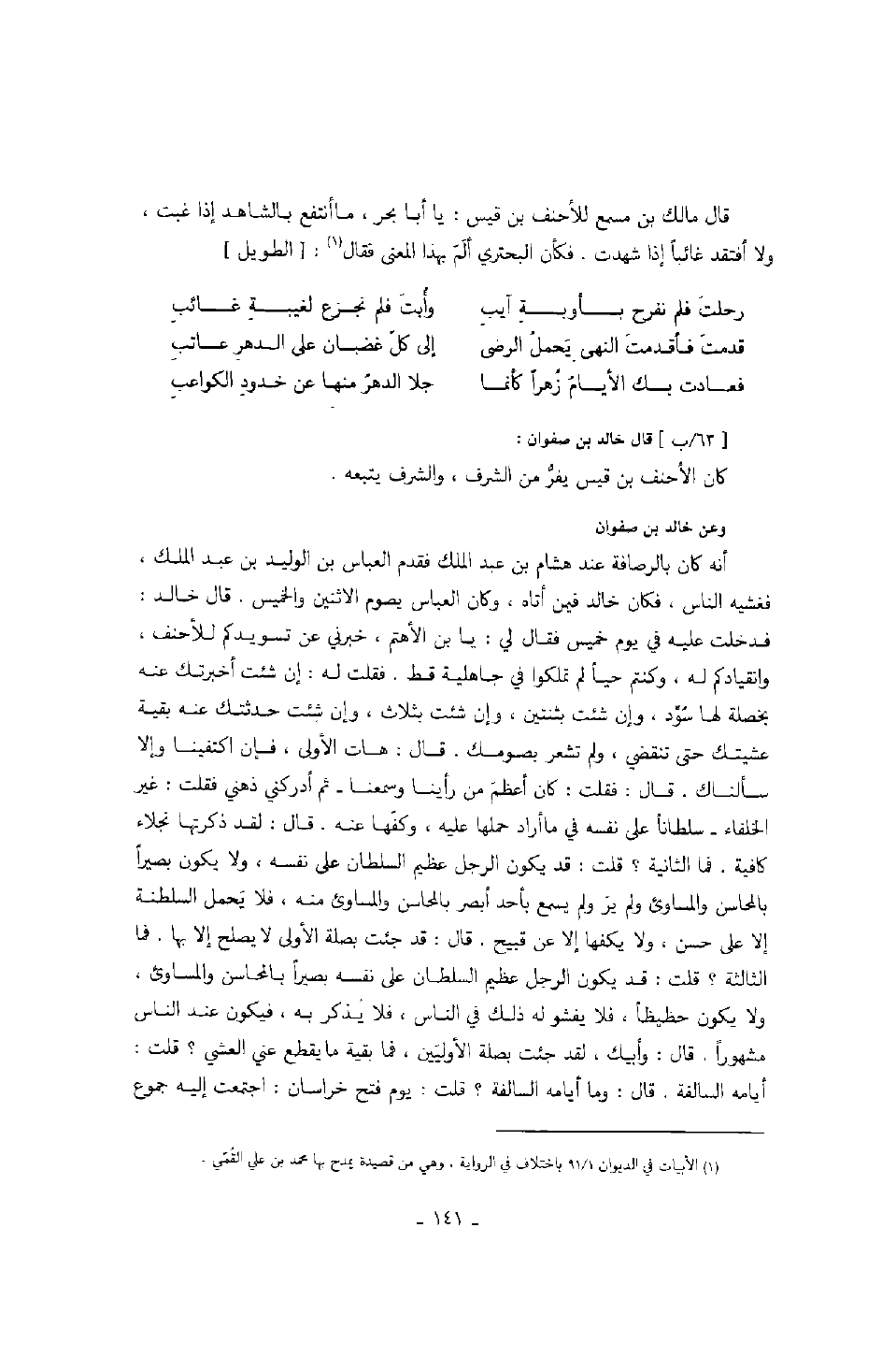 وعن خالد بن صفوان أنه كان بالرصافة عند هشام بن عبد الملك فقدم العباس بن الوليد بن عبد الملك، فغشيه الناس، فكان خالد فيمن أتاه، وكان العباس يصوم الاثنين والخميس. قال خالد: فدخلت عليه في يوم خميس فقال لي: يا بن الأهتم، خبرني عن تسويدكم للأحنف، وانقيادكم له، وكنتم حياً لم تملكوا في جاهلية قط. فقلت له: إن شئت أخبرتك عنه بخصلة لها سُوِّد، وإن شئت بثنتين، وإن شئت بثلاث، وإن شئت حدثتك عنه بقية عشيتك حتى تنقضي، ولم تشعر بصومك. قال: هات الأولى، فإن اكتفينا وإلا سألناك. قال: فقلت: كان أعظمّ من رأينا وسمعنا - ثم أدركني ذهني فقلت: غير الخلفاء - سلطاناً على نفسه في ما أراد حملها عليه، وكفّها عنه. قال: لقد ذكرتها نجلاء كافية. فما الثانية؟ قلت: قد يكون الرجل عظيم السلطان على نفسه، ولا يكون بصيرا بالمحاسن والمساوىء ولم يرَ ولم يسمع بأحد أبصر بالمحاسن والمساوىء منه، فلا يَحمل السلطنة إلا على حسن، ولا يكفها إلى عن قبيح. قال: قد جئت بصلة الأولى لا يصلح إلا بها. فما الثالثة؟ قلت: قد يكون الرجل عظيم السلطان على نفسه بصيراً بالمحاسن والمساوىء، ولا يكون حظيظاً، فلا يفشو له ذلك في الناس، فلا يذكر به، فيكون عند الناس مشهوراً. قال: وأبيك، لقد جئت بصلة الأوليين، فما بقية ما يقطع عني العشي؟ قلت: أيامه السالفة. قال: وما أيامه السالفة؟ قلت: يوم فتح خراسان: اجتمعت إليه جموع
