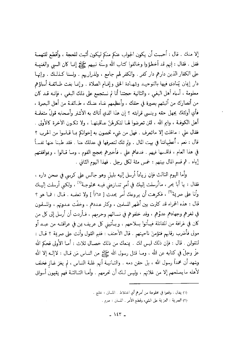 إلا منك. قال: أحببت أن يكون الجواب عنكم منكم ليكون أثبت للحجة، وأقطع للتهمة فقل. فقال: إنهم قد أخطؤوا وخالفوا كتاب الله وسنّة نبيهم صَلَّى اللهُ عَلَيْهِ وَسَلَّمَ إنما كان السبي والغنيمة على الكفار الذين دارهم دار الكفر. والكفر لهم جامع، ولذراريهم. ولسنا كذلك. وإنها دار إيمان يُنادى فيها بالتوحيد وشهادة الحق وإقام الصلاة. وإنما بغت طائفة أسماؤهم معلومة، أسماء أهل البغي، والثانية حجتنا أنا لم نستجمع على ذلك البغي، فإنه قد كان من أنصارك من أثبتهم بصيرة في حقك، وأعظمهم غناء عنك، طائفة من أهل البصرة، فأي أولئك يجهل حقه وينسى قرابته؟ إن هذا الذي أتاك به الأشتر وأصحابه قولُ متغلمة أهل الكوفة، وأيم الله، لئن تعرضوا لها لتكرهُنّ عاقبتها، ولا تكون الآخرة كالأولى. فقال علي: ما قلت إلا ما تعرف. فهل من شيء تخصون به إخوانكم بما قاسوا من الحرب؟ قال: نعم، أعطياتنا في بيت المال. ولم تك لتصرفها في عدلك عنا. فقد طبنا عنها نفساً في هذا العام، فاقسمها فيهم. فدعاهم علي، فأخبرهم بحجج القوم، وما قالوا، وبموافقتهم إياه. ثم قسم المال بينهم: خمسمئة لكل رجل. فهذا اليوم الثاني.