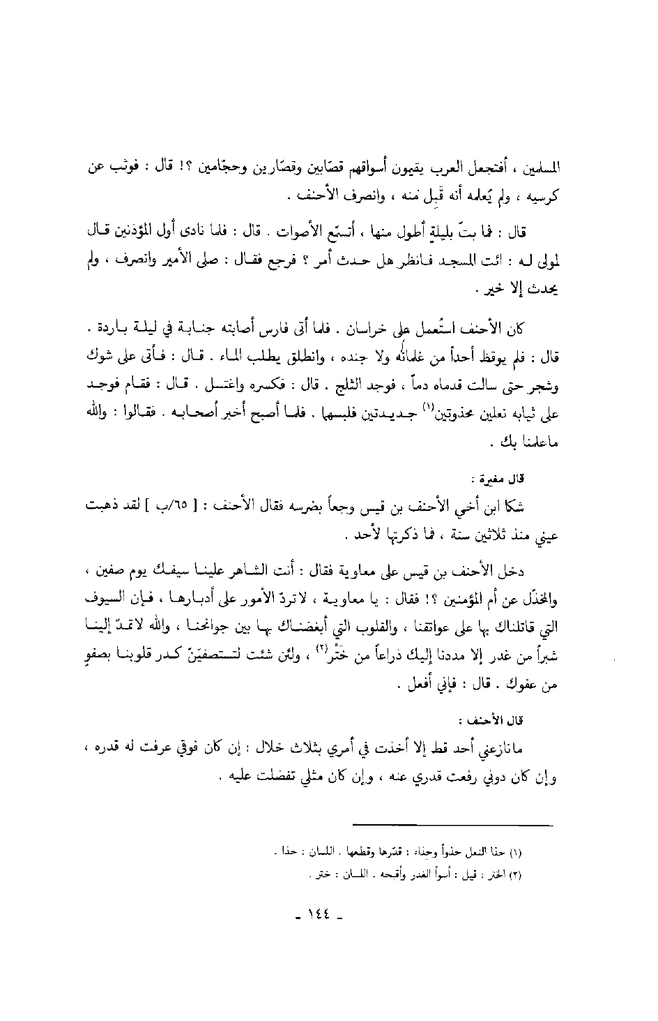 كان الأحنف استُعمل على خراسان. فلما أتى فارس أصابته جنابة في ليلة باردة. قال: فلم يوقظ أحداً من غلمانه ولا جنده، وانطلق يطلب الماء. قال: فأتى على شوك وشجر حتى سالت قدماه دماً، فوجد الثلج. قال: فكسره واغتسل. قال: فقام فوجد على ثيابه نعلين محذوتين جديدتين فلبسهما. فلما أصبح أخبر أصحاب. فقالوا: والله ما علمنا بك.