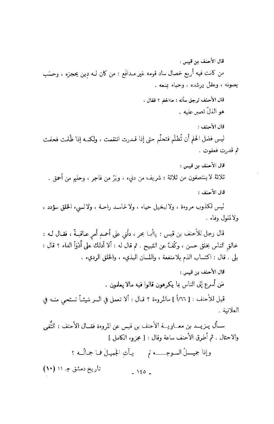 قال الأحنف بن قيس: ثلاثة لا ينتصفون من ثلاثة: شريف من دنيء، وبَرّ من فاجر، وحليم من أحمق.