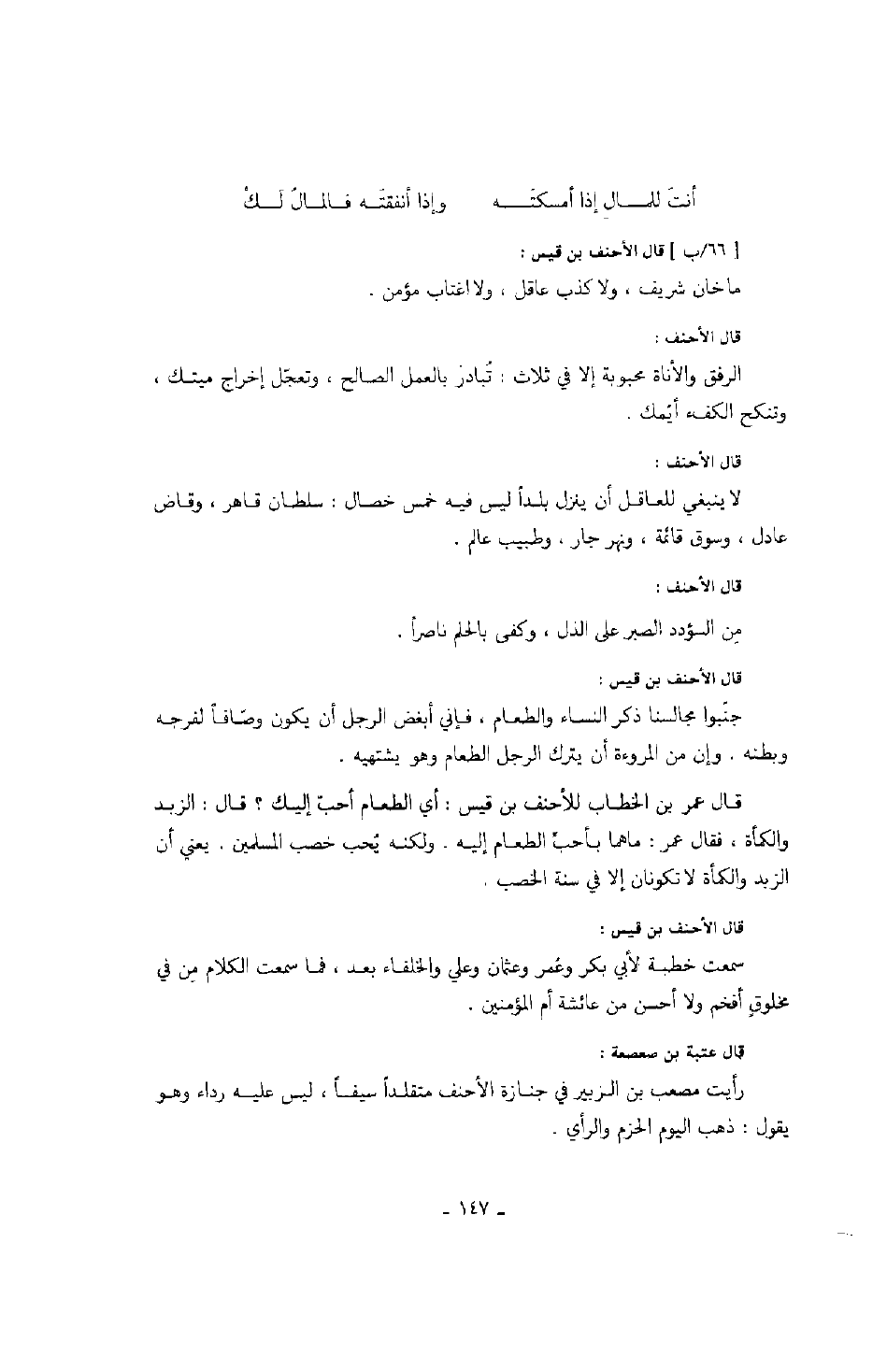 قال الأحنف: لا ينبغي للعاقل أن ينزل بلداً ليس فيه خمس خصال: سلطان قاهر، وقاض عادل، وسوق قائمة، ونهر جار، وطبيب عالم.