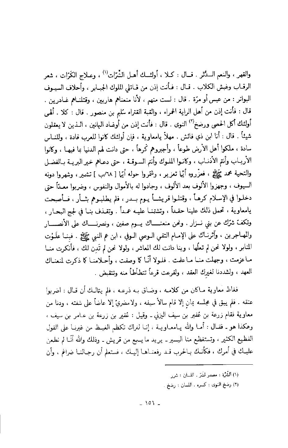 القهر، والنعم الدُّثر. قال: كلا، أولئك أهل الشِّرات، علاج الكَرَات، شعر الرقاب وغبش الكلاب. قال: فأنت إذن من قاتلي الملوك الجبابر، وأحلاف السيوف البواتر: من عبس أو مرّة. قال: لست منهم، لأنا منعناهم هاربين، وقتلناهم غادرين. قال: فأنت إذن من أهل الراية الحمراء، والقبة القتراء سُليم بن منصور. قال: كلا. ألهي أولئك أكل الحصى ورضخ النوى. قال: فأنت إذن من أوغاد اليمانين، الذين لايعقلون شيئاً. قال: أنا ابن ذي فائش. مهلاً يا معاوية، فإن أولئك كانوا للعرب قادة، وللناس سادة، ملكوا أهل الأرض طوعاً، وأجبروهم كرهاً، حتى دانت لهم الدنيا بما فيها، وكانوا الأرباب وأنتم الأذناب، وكانوا الملوك وأنتم السوقة، حتى دعاهم خير البرية بالفضل والتحية محمد صَلَّى اللهُ عَلَيْهِ وَسَلَّمَ، فعزّروه أيَّما تعزير، وشمّروا حوله أيّما تشمير، وشهروا دونه السيوف، وجهزوا الألوف بعد الألوف، وجادوا له بالأموال والنفوس، وضربوا معدّاً حتى دخلوا في الإسلام كرهاً، وقتلوا قريشاً يوم بدر، فلم يطلبوهم بثأر، فأصبحت يا معاوية، تحمل ذلك علينا حقداً، وتشتمنا عليه عمداً. وتقذف بنا في لجج البحار، وتكفّ شرّك عن بني نزار. ونحن منعناك يوم صفين، ونصرناك على الأنصار والمهاجرين، وآثرناك على الإمام التقي الوصي الوفي، ابن عم النبي صَلَّى اللهُ عَلَيْهِ وَسَلَّمَ. فبنا علَوْت المنابر، ولولا نحن لم تعلُها، وبنا دانت لك المعاشر، ولولا نحن لم تَدِن لك، فأنكرت منا ما عزمت، وجهلت منا ما علمت. فلولا أنّا كما وصفت، وأحلامنا كما ذكرت لمنعناك العهد، ولشددنا لغيرِك العقد، ولقرعت قرعاً تتطأطأ منه وتتقبض.