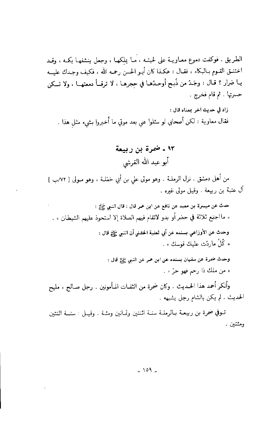 الطريق. فوكفت دموع معاوية على لحيته، ما يملِكها، وجعل ينشفها بكمه، وقد أختنق القوم بالبكاء، فقال: هكذا كان أبو الحسن رحمه الله، فكيف وجدك عليه يا ضرار؟ قال: وجَدُ من ذُبح أو حدُها في حجرها لا ترقأ دمعتها، ولا تسكن حسرتها. ثم قام فخرج.