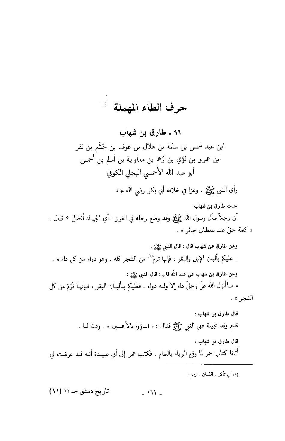 وعن طارق عن شهاب قال: قال النبي صَلَّى اللهُ عَلَيْهِ وَسَلَّمَ: " عليكم بألبان الإبل والبقر، فإنها تَرُمّ من الشجر كله. وهو دواء من كل داء ".