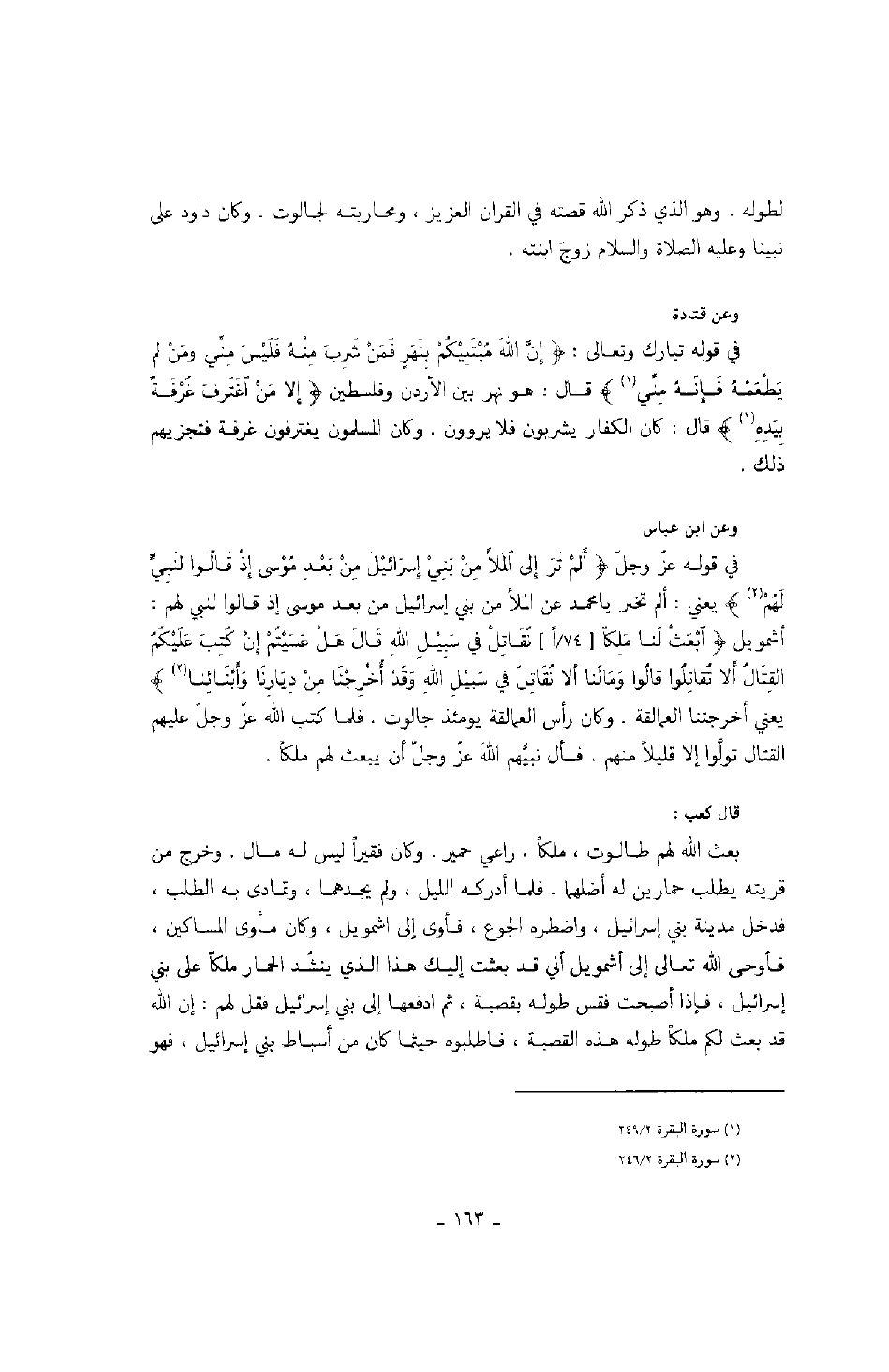 وعن قتادة في قوله تبارك وتعالى: " إِنَّ اللهَ مُبْتَلِيْكُمْ بِنَهَرٍ فَمَنْ شَرِبَ مِنْهُ فَلَيْسَ مِنِّي ومَنْ لم يَطْعَمْهُ فَإِنَّهُ مِنِّي " قال: هو نهر بين الأردن وفلسطين " إِلا مَنْ أغَتَرفَ غُرْفَةً بِيَدِهِ " قال: كان الكفار يشربون فلا يروون. وكان المسلمين يغترفون غرفة فتجزيهم ذلك.