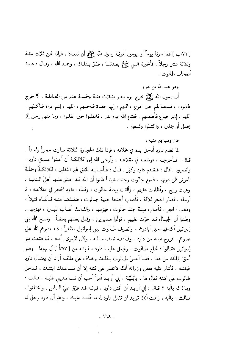 قال وهب بن منبه: لما تقدم داود أدخل يده في مخلاته، فإذا تلك الحجارة الثلاثة صارت حجراً واحداً. قال: فأخرجه، فوضعه في مقلاعه، وأوحى الله إلى الملائكة أن أعينوا عبدي داود، وانصروه. قال: فتقدم داود وكبّر. قال: فأجابه الخلق غير الثقلين: الملائكةُ وحملَةُ العرش فمن دونهم، فسمع جالوت وجنده شيئاً ظنوا أن الله قد حشر عليهم أهلّ الدنيا، وهبت ريح، وأظلمت علهيم، وألقت بيضة جالوت، وقذف داود الحجر في مقلاعه، ثم أرسله، فصار الحجر ثلاثة، فأصاب أحدها جبهة جالوت، فنفذها منه فألقاه قتيلاً، وذهب الحجر، فأصاب ميمنة جند جالوت، فهزمهم، والثالث أصاب الميسرة، فهزمهم. وظنوا أن الجبال قد خرّت عليهم، فولُّوا مدبرين، وقتل بعضهم بعضاً. ومنح الله بني إسرائيل أكتافهم حتى أبادوهم، وانصرف طالوت ببني إسرائيل مظفراً، قد نصرهم الله على عدوهم، فزوج ابنته من داود، وقاسمه نصف ماله. وكان لا يرى رأيه، فاجتمعت بنو إسرائيل فقالوا: نخلع طالوت، ونجعل علينا داود، فإنه من آل يهوذا، وهو أحق بالملك من هذا. فلما أحسّ طالوت بذلك وخاف على ملكه أراد أن يغتال داود فيقتله، فأشار عليه بعض وزرائه أنك لا تقدر على قتله إلا أن تساعدك ابنتك، فدخل طالوت على ابنته فقال لها: يا بُنّيَّة، إني أريد أمراً أحب أن تساعديني عليه. قالت: وما ذاك يا أبه؟ قال: إني أريد أ، أقتل داود، فإنه قد فرّق عليّ الناس، واختلفوا، فقالت: يا أبه، زعمت أنك تريد أن تقتل داود لما قد أفسد عليك، وأعلم أن داود رجل له