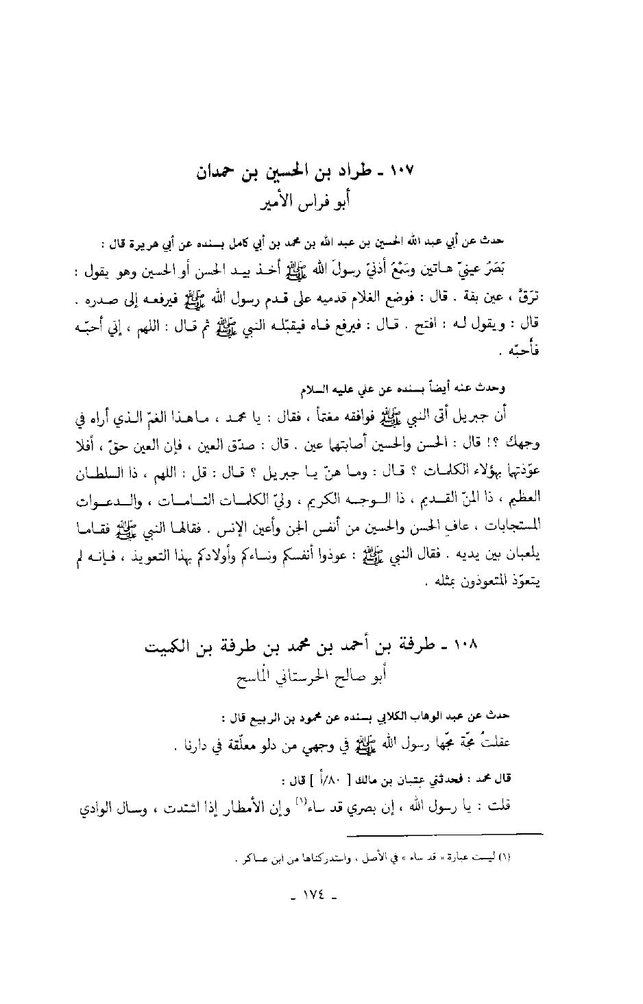 أبو فراس الأمير حدث عن أبي عبد الله الحسين بن عبد الله بن محمد بن أبي كامل بسنده عن أبي هريرة قال: بَصَرُ عينيّ هاتين وسَمْعُ أذنيّ رسولَ الله صَلَّى اللهُ عَلَيْهِ وَسَلَّمَ أخذ بيد الحسن أو الحسين وهو يقول: ترَقَّ، عين بقة. قال: فوضع الغلام قدميه على قدم رسول الله صَلَّى اللهُ عَلَيْهِ وَسَلَّمَ فيرفعه إلى صدره. قال: ويقول له: افتح. قال: فيرفع فاه فيقبّله النبي صَلَّى اللهُ عَلَيْهِ وَسَلَّمَ ثم قال: اللهم، إن أحبّه فأحبّه.
