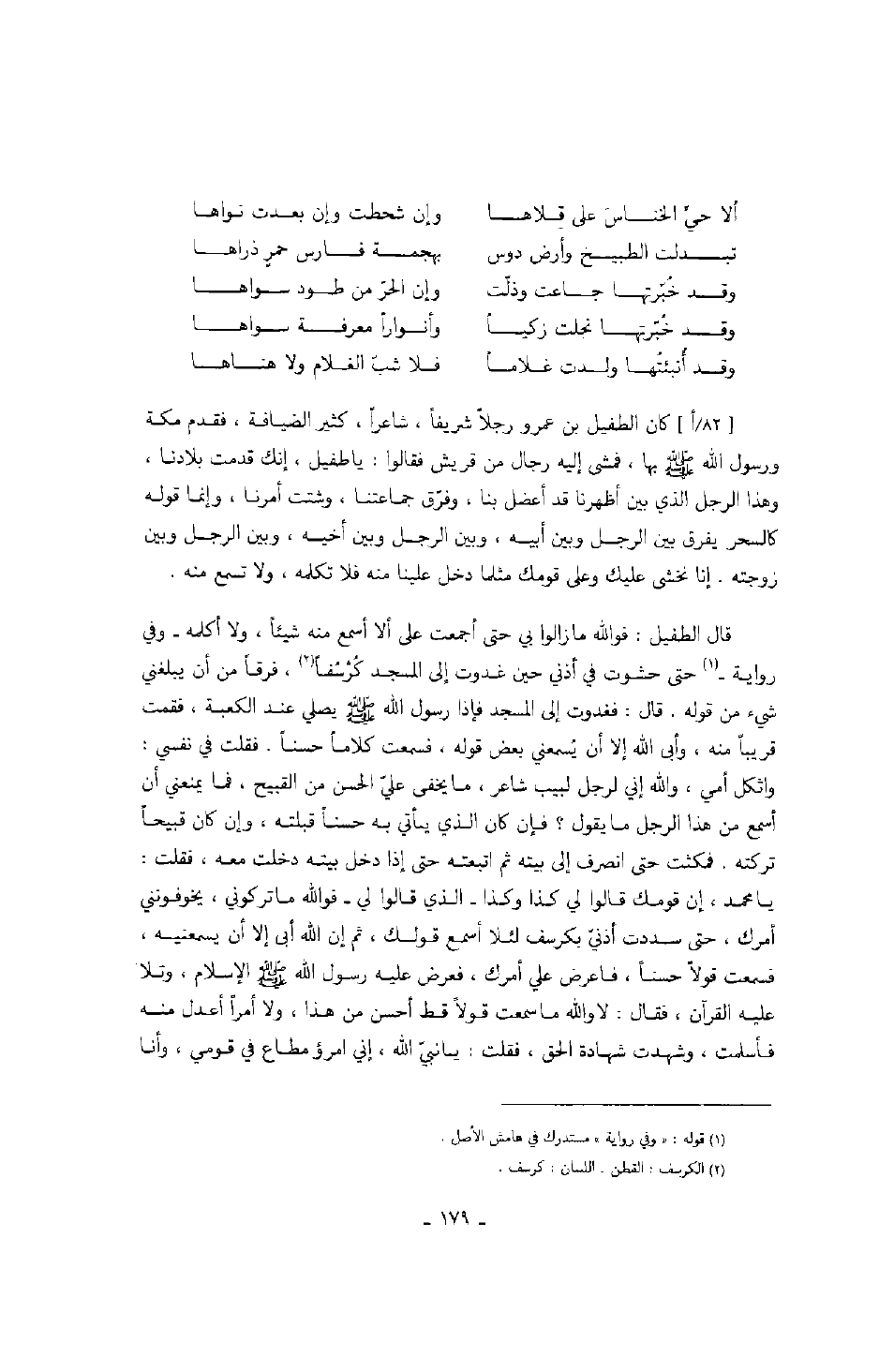 قال الطفيل: فوالله ما زالوا بي حتى أجمعت على ألا أسمع منه شيئاً، ولا أكلمه وفي رواية حتى حشوت في أذني حين غدوت إلى المسجد كُرْسُفاً، فرقاً من أني يبلغني شيء من قوله. قال: فغدوت إلى المسجد فإذا رسول الله صَلَّى اللهُ عَلَيْهِ وَسَلَّمَ يصلي عند الكعبة، فقمت قريباً منه، وأبى الله إلا أن يُسمعني بعض قوله، فسمعت كلاماً حسناً. فقلت في نفسي: واثكل أمي، والله إني لرجل لبيب شاعر، ما يخفى عليّ الحسن من القبيح، فما يمنعني أن أسمع من هذا الرجل ما يقول؟ فإن كان الذي يأتي به حسناً قبلته، وإن كان قبيحاً تركته. فمكثت حتى انصرف إلى بيته ثم اتبعته حتى إذا دخل بيته دخلت معه، فقلت: يا محمد، إن قومك قالوا لي كذا وكذا الذي قالوا لي فوالله ما تركوني، يخوفونني أمرك، حتى سددت أذنيّ بكرسف لئلا أسمع قولك، ثم قم إن الله أبى إلا أن يسمعنيه، فسمعت قولاً حسناً، فاعرض علي أمرك، فعرض عليه رسول الله صَلَّى اللهُ عَلَيْهِ وَسَلَّمَ الإسلام، وتلا عليه القرآن، فقال: لا والله ما سمعت قولاً قط أحسن من هذا، ولا أمراً أعدل منه فأسلمت، وشهدت شهادة الحق، فقلت: يا نبيّ الله، إني امرؤ مطاع في قومي، وأنا