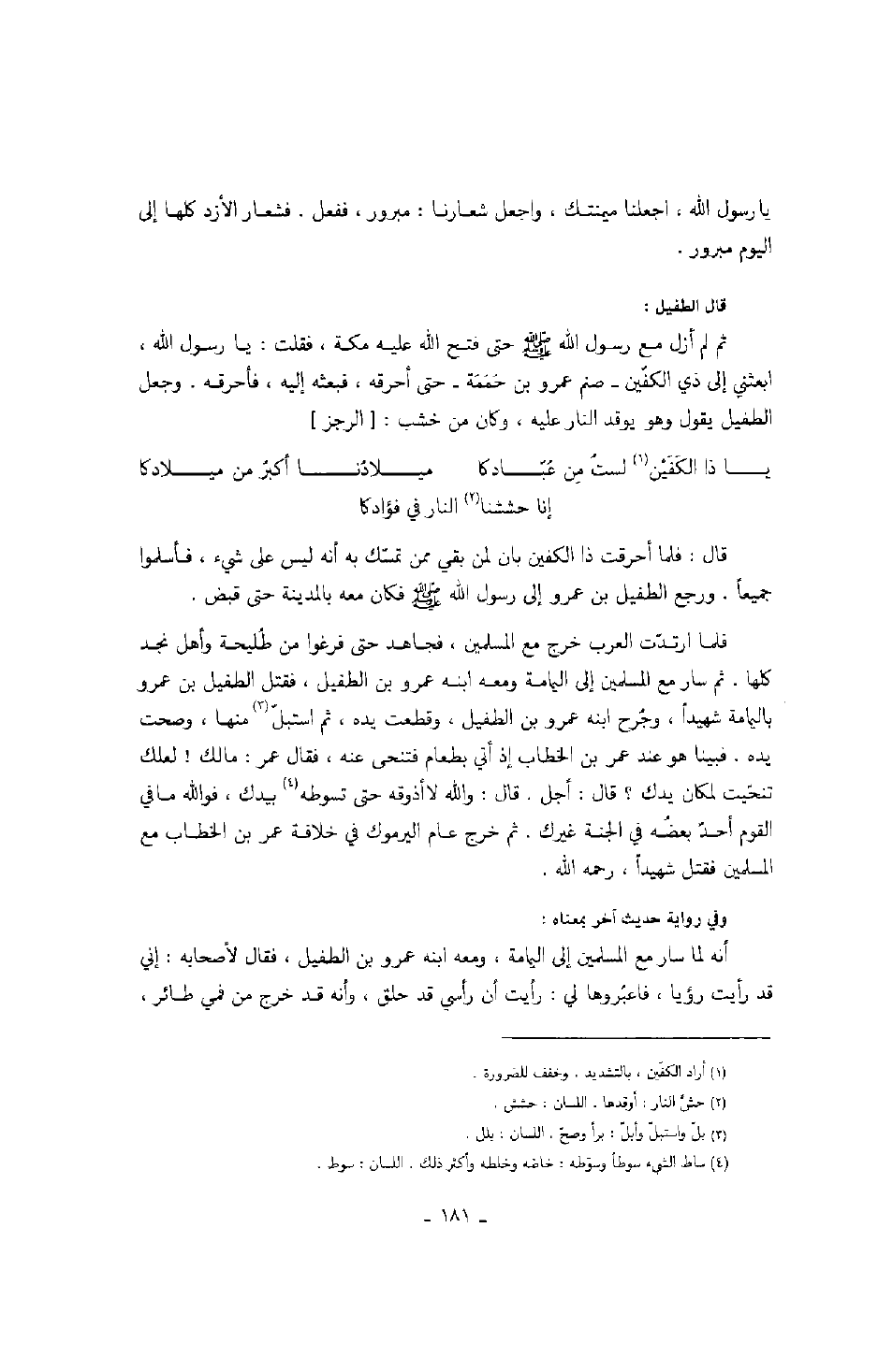 قال الطفيل: ثم لم أزل مع رسول الله صَلَّى اللهُ عَلَيْهِ وَسَلَّمَ حتى فتح الله عليه مكة، فقلت: يا رسول الله، ابعثني إلى ذي الكفّين صنم عمر بن حَمَمَة حتى أحرقه، فبعثه إليه، فأحرقه. وجعل الطفيل يقول وهو يوقد النار عليه، وكان خشب: " الرجز "