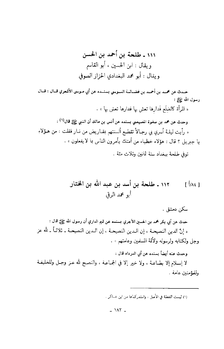ويقال: ابن الحسين، أبو القاسم ويقال: أبو محمد البغدادي الخزاز الصوفي حدث عن محمد بن أحمد بن فضالة السوسي بسنده عن أبي موسى الأشعري قال: قال رسول الله صَلَّى اللهُ عَلَيْهِ وَسَلَّمَ: " المرأة كالضِلَع فَدارِهَا تعش بها فدارها تعش بها " وحدث عن محمد بن صفوة المصيصي بسنده عن أنس بن مالك أن النبي صَلَّى اللهُ عَلَيْهِ وَسَلَّمَ قال: " رأيت ليلة أسري بي رجالاً تقطع ألسنتهم بمقاريض من نار فقلت: من هؤلاء يا جبريل؟ قال: هؤلاء خطباء من أمتك يأمرون الناس بما لا يفعلون " توفي طلحة ببغداد سنة ثمانين وثلاث مئة.