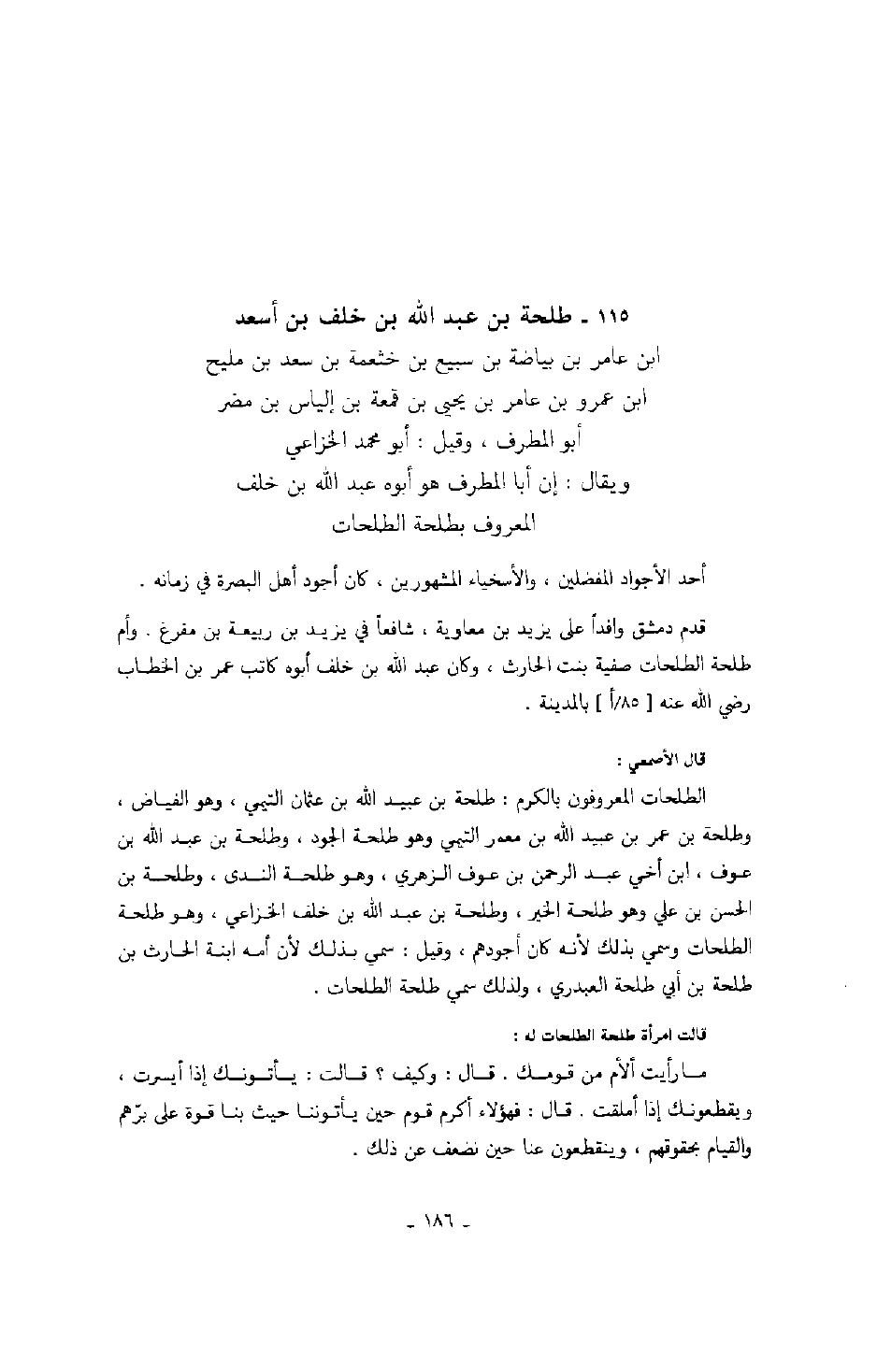 ابن أسعد بن عامر بن بياضة بن سبيع بن خثعمة بن سعد بن مليح ابن عمرو بن عامر بن يحيى بن قمعة بن إلياس بن مضر أبو المطرف، وقيل: أبو محمد الخزاعي ويقال: إن أبا المطرف هو أبوه عبد الله بن خلف المعروف بطلحة الطلحات أحد الأجواد المفضلين، والأسخياء المشهورين، كان أجود أهل البصرة في زمانه.