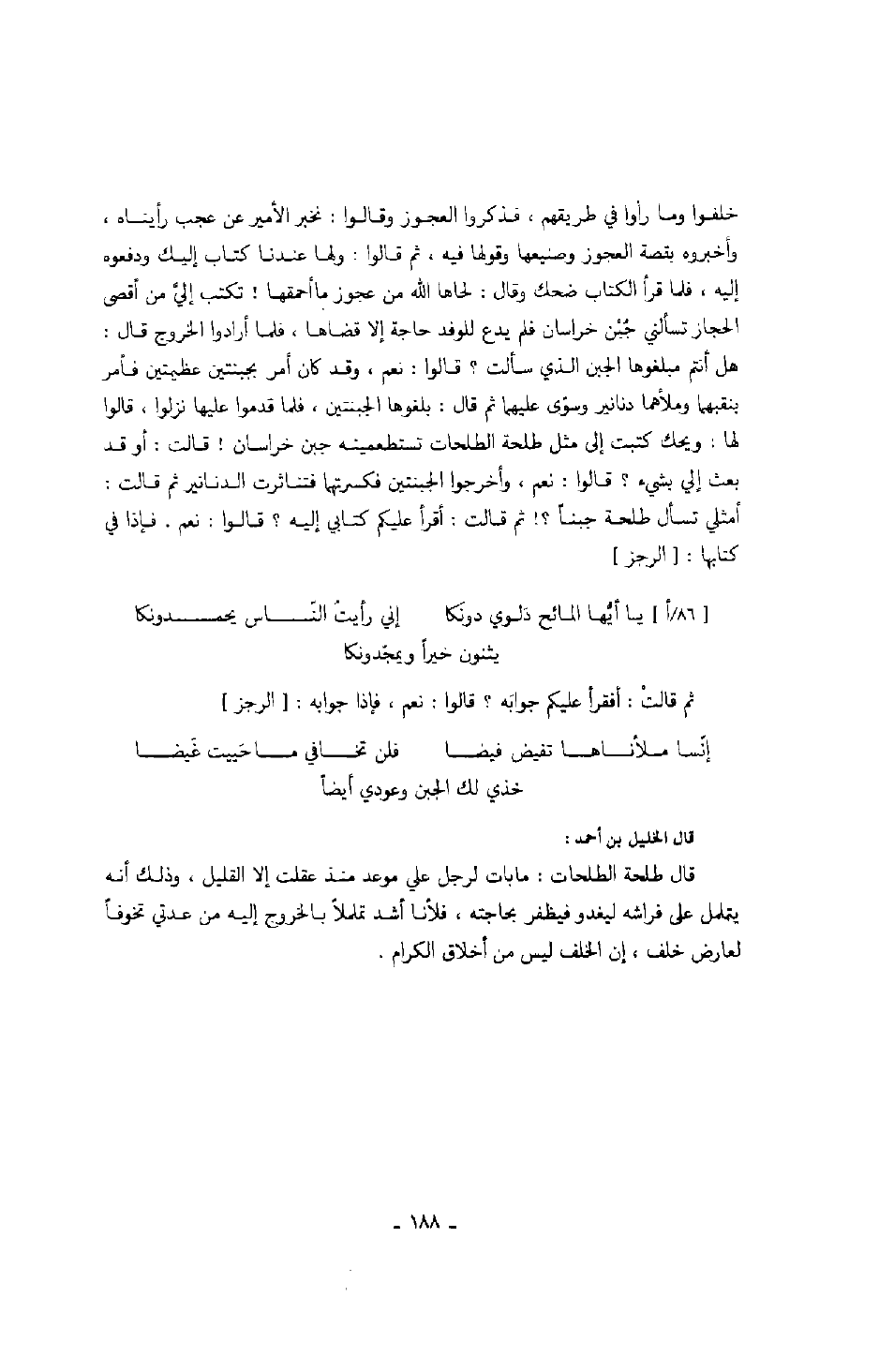خلفوا وما رأوا في طريقهم، فذكروا العجوز وقالوا: نخبر الأمير عن عجب رأيناه، وأخبروه بقصة العجوز وصنيعها وقولها فيه، ثم قالوا: ولها عندنا كتاب إليك ودفعوه إليه، فلما قرأ الكتاب ضحك وقال: لحاها الله من عجوز ما أحمقها! تكتب إليَّ من أقصى الحجاز تسألني جُبْن خراسان فلم يدع للوفد حاجة إلا قضاها، فلما أرادوا الخروج قال: هل أنتم مبلغوها الجبن الذي سألت؟ قالوا: نعم، وقد كان أمير بجبنتين عظيمتين فأمر بنقبهما وملأهما دنانير وسوّى عليهما ثم قال: بلغوها الجبنتين، فلما قدموا عليها نزلوا، قالوا لها: ويحك كتبت إلى مثل طلحة الطلحات تستطعمينه جبن خراسان! قالت: أو قد بعث إلي بشيء؟ قالوا: نعم، وأخرجوا الجبنتين فكسرتهما فتناثرت الدنانير ثم قالت: أمثلي تسأل طلحة جبناً؟! ثم قالت: أقرأ عليكم كتابي إليه؟ قالوا: نعم. فإذا في كتابها: " الرجز "
