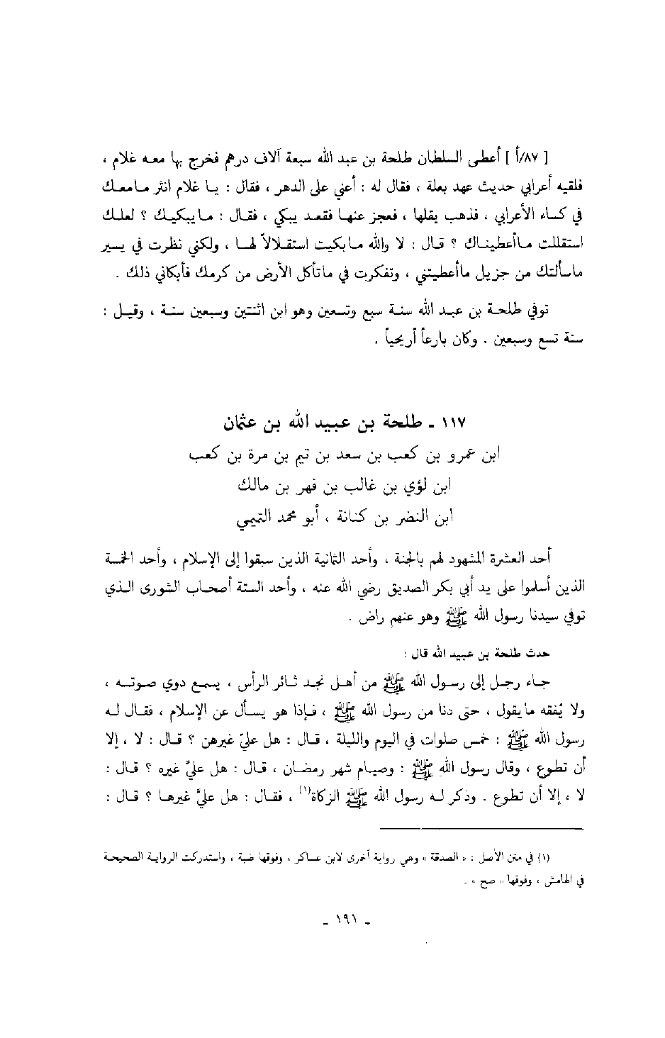 حدث طلحة بن عبيد الله قال: جاء الرجل إلى رسول الله صَلَّى اللهُ عَلَيْهِ وَسَلَّمَ من أهل نجد ثائر الرأس، يسمع دوي صوته، ولا يُفقه ما يقول، حتى دنا من رسول الله صَلَّى اللهُ عَلَيْهِ وَسَلَّمَ، فإذا هو يسأل عن الإسلام، فقال له رسول الله صَلَّى اللهُ عَلَيْهِ وَسَلَّمَ: خمس صلوات في اليوم والليلة، قال: هل عليّ غيرهن؟ قال: لا، إلا أن تطوع، وقال رسول الله صَلَّى اللهُ عَلَيْهِ وَسَلَّمَ: وصيام شهر رمضان، قال: هل عليَّ غيرهن؟ قال: لا، إلا أن تطوع. وذكر له رسول الله صَلَّى اللهُ عَلَيْهِ وَسَلَّمَ الزكاة، فقال: هل عليَّ غيرها؟ قال: