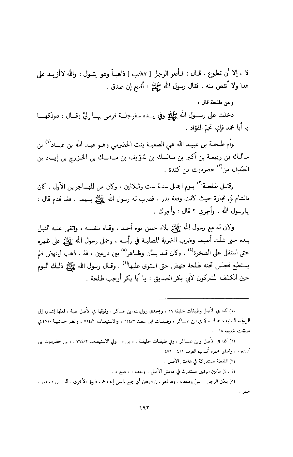 وقتل طلحة يوم الجمل سنة ست وثلاثين، وكان من المهاجرين الأول، كان بالشام في تجارة حيث كانت وقعة بدر، فضرب له رسول الله صَلَّى اللهُ عَلَيْهِ وَسَلَّمَ بسهمه. فلما قدم قال: يا رسول الله، وأجري؟ قال: وأجرك.