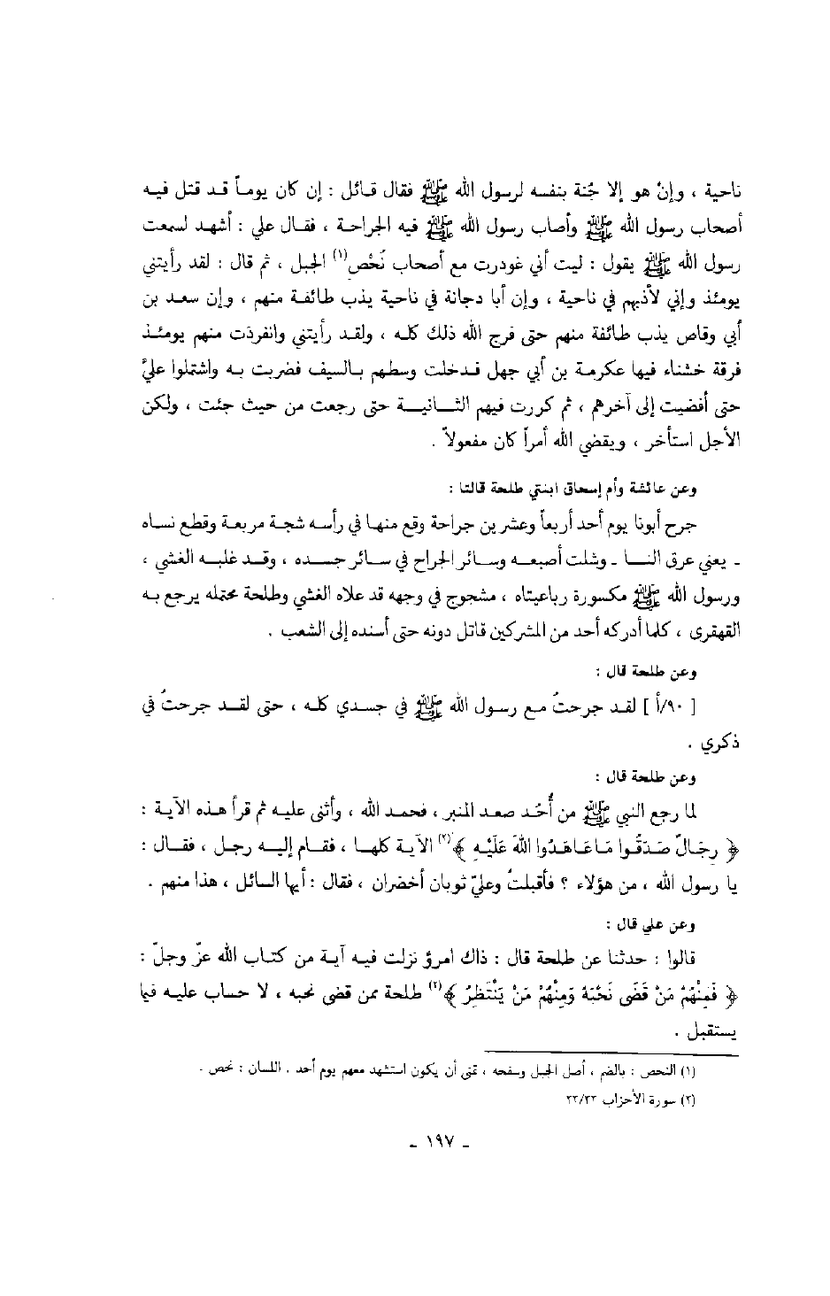 وعن طلحة قال: لما رجع النبي صَلَّى اللهُ عَلَيْهِ وَسَلَّمَ من أُحُد صعد المنبر، فحمد الله، وأثنى عليه ثم قرأ هذه الآية: " رِجَالٌ صَدَقُوا ما عَاهَدوا واللهَ عَلَيْهِ " الآية كلها، فقام إليه رجل، فقال يا رسول الله، من هؤلاء فأقبلتُ وعليّ ثوبان أخضران، فقال: أيها السائل، هذا منهم.
