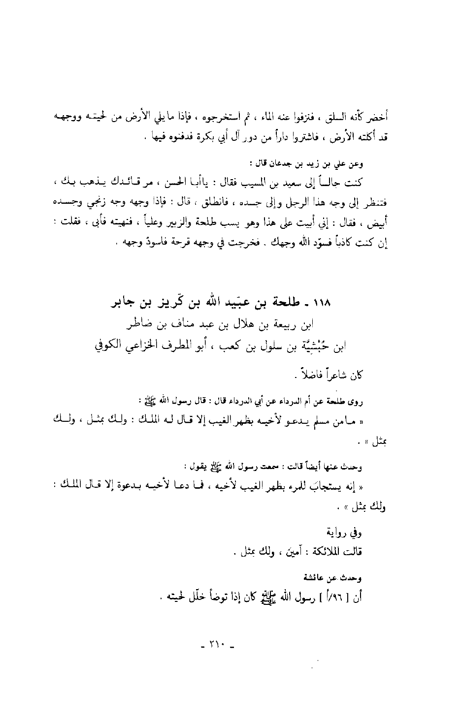ابن جابر بن ربيعة بن هلال بن عبد مناف بن ضاطر ابن حَبْشِيَّة بن سلول بن كعب، أبو المطرف الخزاعي الكوفي روى طلحة عن أم الدرداء عن أبي الدرداء قال: قال رسول الله صَلَّى اللهُ عَلَيْهِ وَسَلَّمَ: " ما من مسلم يدعو لأخيه بظهر الغيب إلا قال له الملك: ولك بمثل، ولك بمثل ".