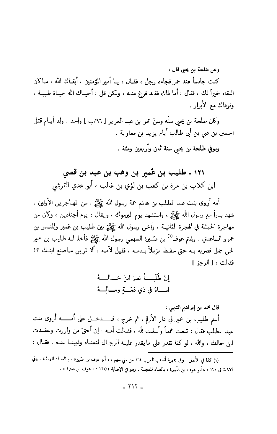 ابن عبد بن قصي بن كلاب بن مرة بن كعب بن لؤي بن غالب أبو عدي القرشي أمه أروى بنت عبد المطلب بن هاشم عمة رسول الله صَلَّى اللهُ عَلَيْهِ وَسَلَّمَ. من المهاجرين الأولين. شهد بدراً مع رسول الله صَلَّى اللهُ عَلَيْهِ وَسَلَّمَ، واستشهد يوم اليرموك، ويقال: يوم أجنادين، وكان من مهاجرة الحبشة في الهجرة الثانية، وآخى رسول الله صَلَّى اللهُ عَلَيْهِ وَسَلَّمَ بين طليب بن عُمير والمنذر بن عمرو الساعدي. وشتم عوف بن صُبيرة السهمي رسول الله صَلَّى اللهُ عَلَيْهِ وَسَلَّمَ فأخذ له طليب بن عمير لحي جمل فضربه به حتى سقط مزملاً بدمه، فقيل لأمه: ألا ترين ما صنع ابنك؟! فقالت: " الرجز "