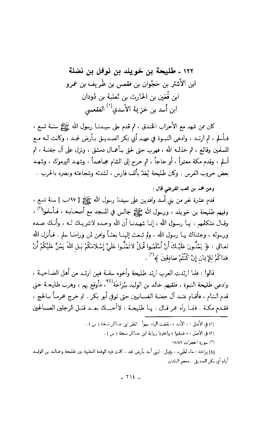 ابن نضلة بن الأشتر بن حَجْوان بن فقعس بن طَريف بن عمرو ابن قُعَين بن الحارث بن ثعلبة ابن دُودان ابن أسد بن خزيمة الأسدي الفقعسي كان ممن شهد من الأحزاب الخندق، ثم قدم على سيدنا رسول الله صَلَّى اللهُ عَلَيْهِ وَسَلَّمَ سنة تسع، فأسلم، ثم أرتد، وادعى النبوة في عهد أبي بكر الصديق بأرض نجد، وكانت له مع المسلمين وقائع، ثم خذله الله، فهرب حتى لحق بأعمال دمشق، ونزل على آل جفنة، ثم أسلم، وقدم مكة معتمراً، أو حاجاً، ثم خرج إلى الشام مجاهداً، وشهد اليرموك، وشهد بعض حروب الفرس. وكان طليحة يُعَدّ بألف فارس، لشدته وشجاعته وبصره بالحرب.