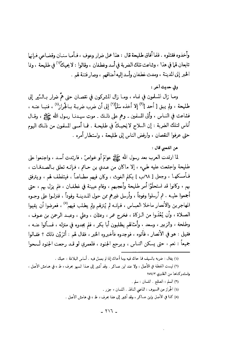 عن الشعبي قال: لما ارتدت العرب بعد رسول الله صَلَّى اللهُ عَلَيْهِ وَسَلَّمَ عوامّ أو خواصّ، فارتدت أسد، واجتمعوا على طليحة واجتمعت عليه طيء. إلا ما كان من عدي بن حاتم، فإنه تعلق بالصدقات، فأمسكها، وجعل يكلم الغوث، وكان فيهم مطاعاً، فيتلطف لهم، ويترفق بهم، وكانوا قد استحلَوا أمر طليحة وأعجبهم، وقام عيينة في غطفان، فلم يزل بهم، حتى أجمعوا عليه. ثم أرسلوا وفوداً، وأرسل غيرهم، ممن حول المدينة وفوداً، فنزلوا على وجوه المهاجرين والأنصار ما خلا العباس، فإنه لم يُنزلهم ولم يطلب فيهم، فعرضوا أن يقيموا الصلاة، وأن يُعْفَوا من الزكاة، فخرج عمر، وعثمان، وعلي، وعبد الرحمن بن عوف، وطلحة، والزبير، وسعد، وأمثالهم يطلبون أبا بكر، فلم يجدوه في منزله، فسألوا عنه، فقيل: هو في الأنصار، فأتوه، فوجدوه فأخبروه الخبر، فقال لهم: أترَوْن ذلك؟ فقالوا جميعاً: نعم، حتى يسكن الناس، ويرجع الجنود، فلعمري لو قد رجعت الجنود لَسمحوا