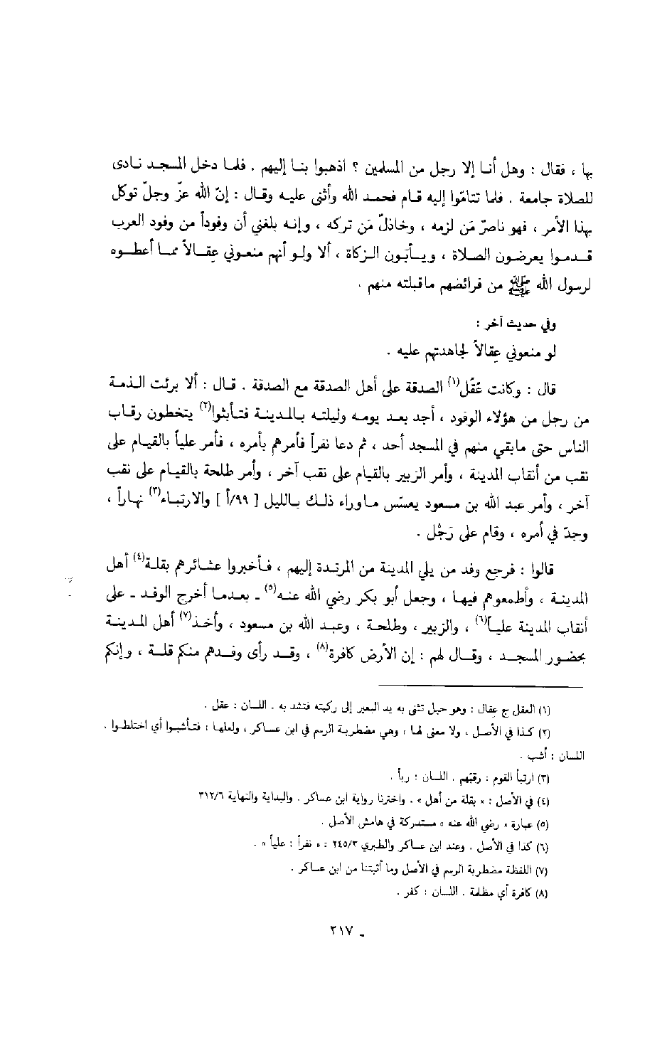 بها، فقال: وهل أنا إلا رجل من المسلمين؟ ذهبوا بنا إليهم. فلما دخل المسجد نادى للصلاة جامعة. فلما تتامّوا إليه قام فحمد الله وأثنى عليه وقال: إنّ الله عزّ وجلّ توكل بهذا الأمر، فهو ناصرٌ من لزمه، وخاذلٌ مَن تركه، وإنه بلغني أن وفوداً من وفود العرب قدموا يعرضون الصلاة، ويأبَون الزكاة، ألا ولو أنهم منعوني عِقالاً مما أعطوه لرسول الله صَلَّى اللهُ عَلَيْهِ وَسَلَّمَ من فرائضهم ما قبلته منهم. وفي حدث آخر: لو منعوني عِقالاً لجاهدتهم عليه. قال: وكانت عُقُل الصدقة على أهل الصدقة مع الصدقة. قال: ألا برئت الذمة من رجل من هؤلاء الوفود، أجد بعد يومه وليلته بالمدينة فتأبثوا يتخطون رقاب الناس حتى ما بقي منهم في المسجد أحد، ثم دعا نفراً فأمرهم بأمره، فأمر علياً بالقيام على نقب من أنقاب المدينة، وأمر الزبير بالقيام على نقب آخر، وأمر طلحة بالقيام على نقب آخر، وأمر عبد الله بن مسعود يعسّس ما وراء ذلك بالليل والارتباء نهاراً، وجدّ في أمره، وقام على رَجْل. قالوا: فرجع وفد من يلي المدينة من المرتدة إليهم، فأخبروا عشائرهم بقلة أهل المدينة، وأطمعوهم فيها، وجعل أبو بكر رضي الله عنه بعدما أخرج الوفد على أنقاب المدينة علياً، والزبير، وطلحة وعبد الله بن مسعود، وأخذ أهل المدينة بحضور المسجد، وقال لهم: إن الأرض كافرة، وقد رأى وفدهم منكم قلة، وإنكم