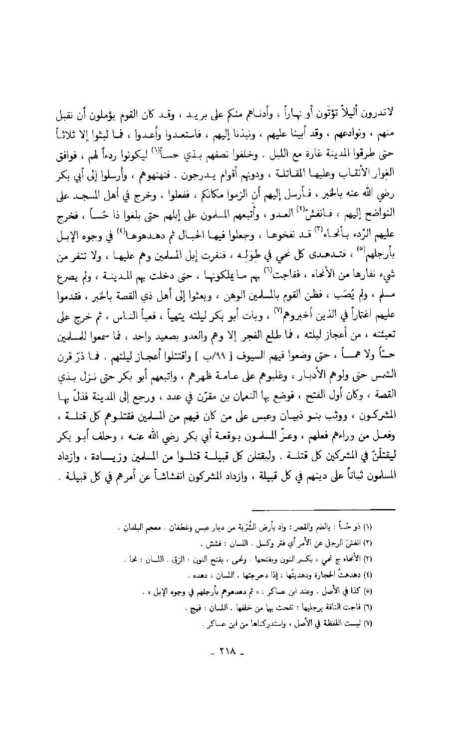 لا تدرون أليلاً تؤتون أو نهاراً، وأدناهم منكم على بريد، وقد كان القوم يؤملون أن نقبل منهم، ونوادعهم، وقد أبينا عليهم، فاستعدوا وأعدوا، فما لبثوا إلا ثلاثاً حتى طرقوا المدينة غارة مع الليل. وخلفوا نصفهم بذي حساً ليكونوا ردءاً لهم، فوافق الغوار الأنقاب وعليها المقاتلة، ودونهم أقوام يدرجون. فنهنهوهم، وأرسلوا إلى ابي بكر رضي الله عنه بالخبر، فأرسل إليهم أن الزموا مكانكم، ففعلوا، وخرج في أهل المسجد على النواضح إليهم، فانفشّ العدو، وأتبعهم المسلمون على إبلهم حتى بلغوا ذا حُساً، فخرج عليهم الرِّدء بأنحاء قد نفخوها، وجعلوا فيها الحبال ثم دهدهوها في وجوه الإبل بأرجلهم، فتدهدى كل نحي في طوَلِه، فنفرت إبل المسلمين وهم عليها، ولا تنفر من شيء نفارها من الأنحاء، ففاجت بهم ما يملكونها، حتى دخلت بهم المدينة، ولم يصرع مسلم، ولم يُصَب، فظن القوم بالمسلمين الوهن، وبعثوا إلى أهل ذي القصة بالخبر، فقدموا عليهم اغتماراً في الذين أخبروهم، وبات أبو بكر ليلته يتهيأ، فعبأ الناس، ثم خرج على تعبئته، من أعجاز ليلته، فما طلع الفجر إلا وهم والعدو بصعيد واحد، فما سمعوا للمسلمين حسّاً ولا همساً، حتى وضعوا فيهم السيوف واقتتلوا أعجاز ليلتهم. فما ذرّ قرن الشمس حتى ولوهم الأدبار، وغلبوهم على عامة ظهرهم، واتبعهم أبو بكر حتى نزل بذي القصة، وكان أول الفتح، فوضع بها النعمان بن مقرّن في عدد، ورجع إلى المدينة فذلّ بها المشركون، ووثب بنو ذبيان وعبس على من كان فيهم من المسلمين فقتلوهم كل قتلة، وفعل من وراءهم فعلهم، وعزّ المسلمون بوقعة أبي بكر رضي الله عنه، وحلف أبو بكر ليقتلَنّ في المشركين كل قتل. وليقتلن كل قبيلة قتلوا من المسلمين وزيادة، وازداد المسلمون ثباتاً على دينهم في كل قبيلة، وازداد المشركون أنفشاشاً عن أمرهم في كل قبيلة.