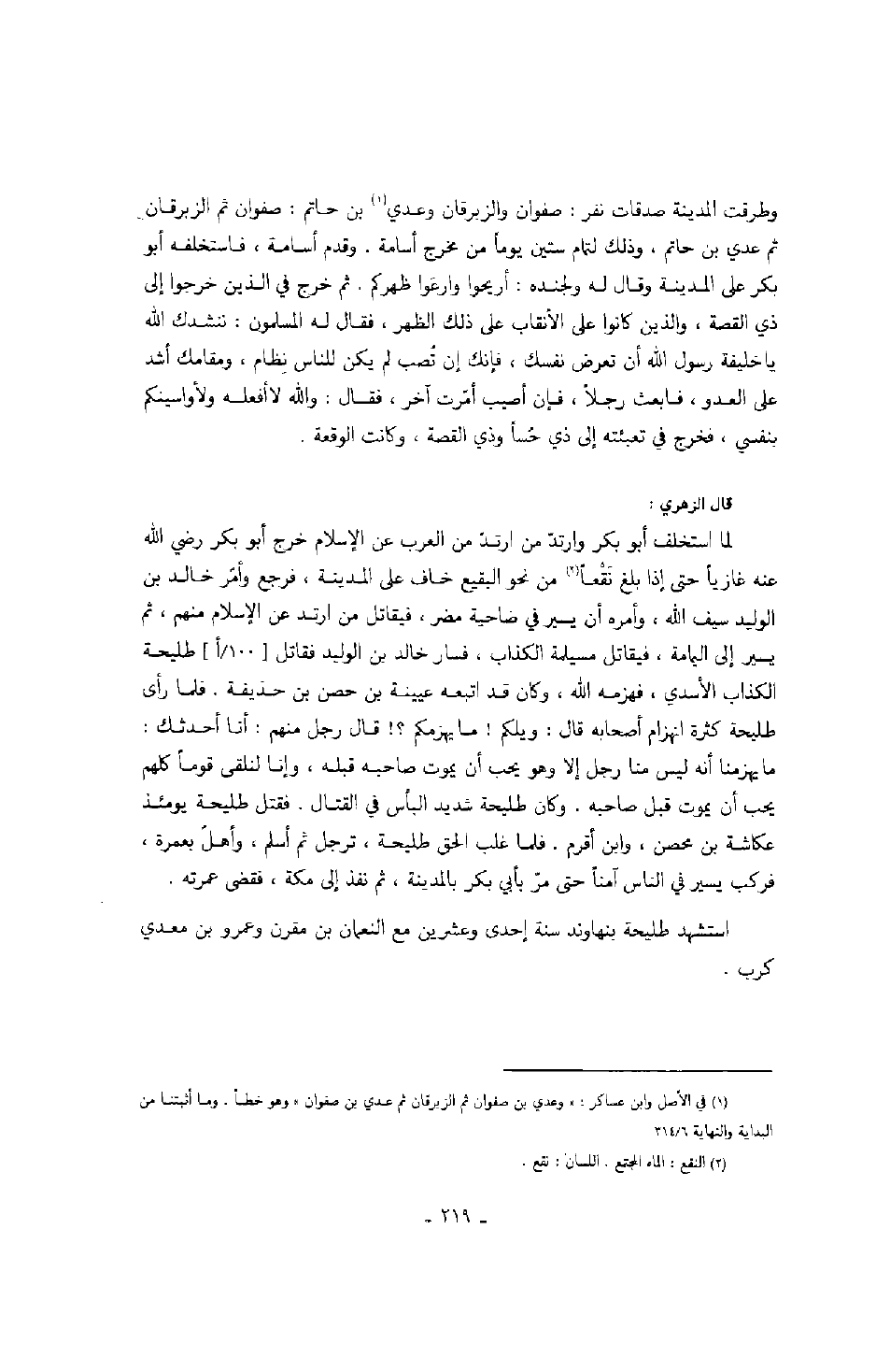 الزبرقان ثم عدي بن حاتم، وذلك لتمام ستين يوماً من مخرج أسامة. وقدم أسامة، فاستخلفه أبو بكر على المدينة وقال له ولجنده: أريحوا وارعَوا ظهركم. ثم خرج في الذين خرجوا إلى ذي القصة، والذين كانوا على الأنقاب على ذلك الظهر، فقال له المسلمون: ننشدك الله يا خليفة رسول الله أن تعرض نفسك، فإنك إن تُصب أمّرت آخر، فقال: والله لا أفعله ولأواسينكم بنفسي، فخرج في تعبئته إلى ذي حُساً وذي القصة، وكانت الوقعة. قال الزهري: لما استخلف أبو بكر وارتدّ من ارتدّ من العرب عن الإسلام خرج أبو بكر رضي الله عنه غازياً حتى إذا بلغ نَقْعاً من نحو البقيع خاف على المدينة، فرجع وأمرّ خالد بن الوليد سيف الله، وأمره أن يسير في ضاحية مضر فيقاتل من ارتد عن الإسلام منهم ثم يسير إلى اليمامة، فيقاتل مسيلمة الكذاب، فسار خالد بن الوليد فقاتل طليحة الكذاب الأسدي، فهزمه الله، وكان قد اتبعه عيينة بن حصن بن حذيفة. فلما رأى طليحة كثرة انهزام أصحابه قال: ويلكم! ما يهزمكم؟! قال رجل منهم: أنا أحدثك: ما يهزمنا أنه ليس منا رجل إلا وهو يحب أن يموت صاحبه قبله، وإنا لنلقى قوماً كلهم يحب أن يموت قبل صاحبه. وكان طليحة شديد البأس في القتال. فقتل طليحة يومئذ عكاشة بن محصن، وابن أقرم. فلما غلب الحق طليحة، ترجل ثم أسلم، وأهلّ بعمرة، فركب يسير في الناس آمناً حتى مرّ بأبي بكر بالمدينة، ثم نفذ إلى مكة، فقضى عمرته. استشهد طليحة بنهاوند سنة إحدى وعشرين مع النعمان بن مقرن وعمرو بن معدي كرب. ثم عدي بن حاتم، وذلك لتمام ستين يوماً من مخرج أسامة. وقدم أسامة، فاستخلفه أبو بكر على المدينة وقال له ولجنده: أريحوا وارعَوا ظهركم. ثم خرج في الذين خرجوا إلى ذي القصة، والذين كانوا على الأنقاب على ذلك الظهر، فقال له المسلمون: ننشدك الله يا خليفة رسول الله أن تعرض نفسك، فإنك إن تُصب أمّرت آخر، فقال: والله لا أفعله ولأواسينكم بنفسي، فخرج في تعبئته إلى ذي حُساً وذي القصة، وكانت الوقعة. قال الزهري: لما استخلف أبو بكر وارتدّ من ارتدّ من العرب عن الإسلام خرج أبو بكر رضي الله عنه غازياً حتى إذا بلغ نَقْعاً من نحو البقيع خاف على المدينة، فرجع وأمرّ خالد بن الوليد سيف الله، وأمره أن يسير في ضاحية مضر فيقاتل من ارتد عن الإسلام منهم ثم يسير إلى اليمامة، فيقاتل مسيلمة الكذاب، فسار خالد بن الوليد فقاتل طليحة الكذاب الأسدي، فهزمه الله، وكان قد اتبعه عيينة بن حصن بن حذيفة. فلما رأى طليحة كثرة انهزام أصحابه قال: ويلكم! ما يهزمكم؟! قال رجل منهم: أنا أحدثك: ما يهزمنا أنه ليس منا رجل إلا وهو يحب أن يموت صاحبه قبله، وإنا لنلقى قوماً كلهم يحب أن يموت قبل صاحبه. وكان طليحة شديد البأس في القتال. فقتل طليحة يومئذ عكاشة بن محصن، وابن أقرم. فلما غلب الحق طليحة، ترجل ثم أسلم، وأهلّ بعمرة، فركب يسير في الناس آمناً حتى مرّ بأبي بكر بالمدينة، ثم نفذ إلى مكة، فقضى عمرته. استشهد طليحة بنهاوند سنة إحدى وعشرين مع النعمان بن مقرن وعمرو بن معدي كرب.
