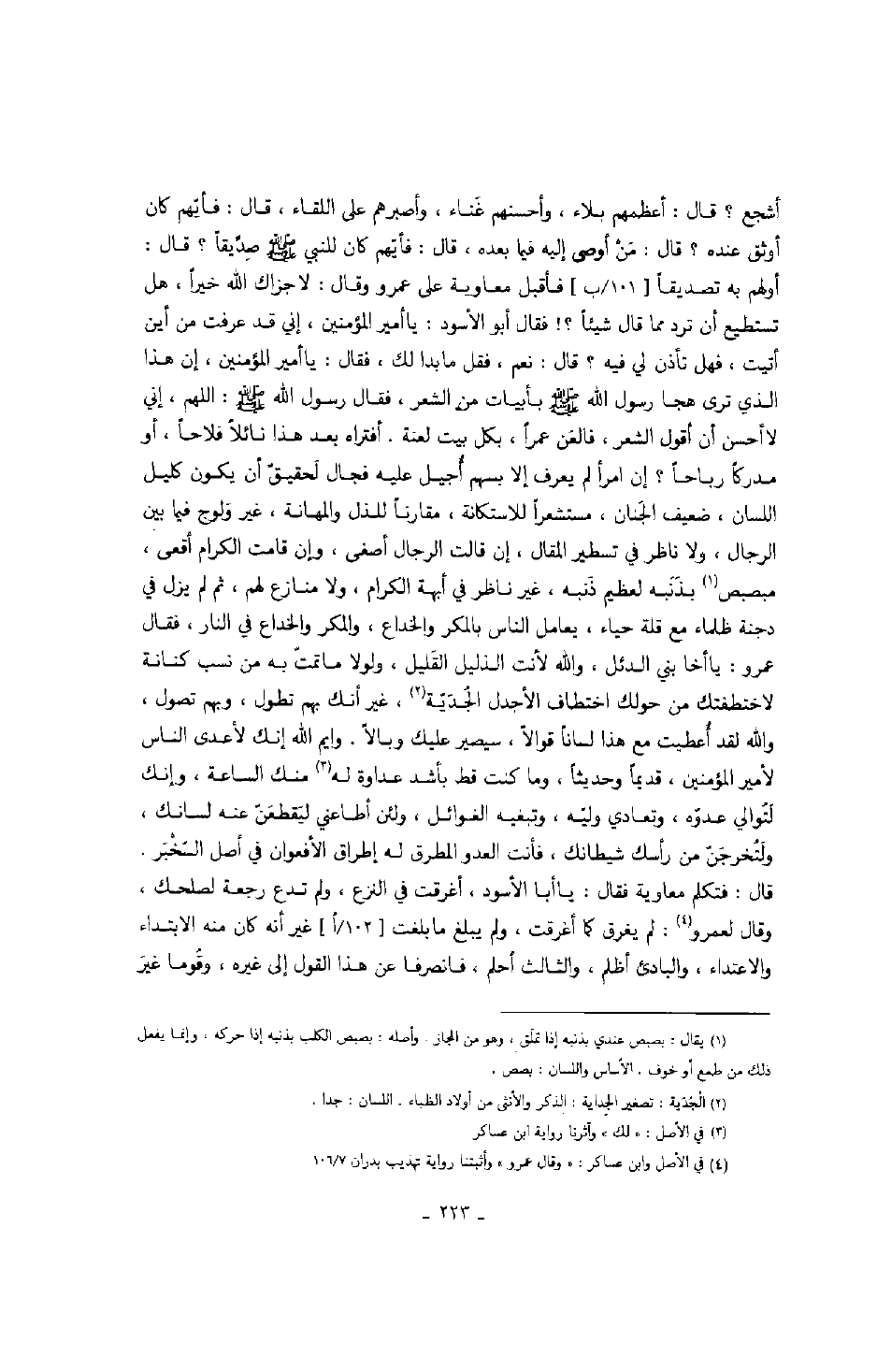 أشجع؟ قال: أعظمهم بلاء، وأحسنهم غَناء، وأصبرهم على اللقاء، قال: فأيّهم كان أوثق عنده؟ قال: مَنْ أوصى إليها فيما بعده، قال: فأيّهم كان للنبي صَلَّى اللهُ عَلَيْهِ وَسَلَّمَ صِدِّيقاً؟ قال: أولهم به تصديقاً فأقبل معاوية على عمرو وقال: لاجزاك الله خيراً، هل تستطيع أن ترد مما قال شيئاً؟! فقال أبو الأسود: يا أمير المؤمنين، إني قد عرفت من أين أتيت، فهل تأذن لي فيه؟ قال: نعم، فقل ما بدا لك، فقال: يا أمير المؤمنين، إن هذا الذي ترى هجا رسول الله صَلَّى اللهُ عَلَيْهِ وَسَلَّمَ بأبيات من الشعر، فقال رسول الله صَلَّى اللهُ عَلَيْهِ وَسَلَّمَ: اللهم، إني لا أحسن أن أقول الشعر، فالعَن عمراً، بكل بيت لعنة. أفتراه بعد هذا نائلاً فلاحاً، أو مدركاً رباحاً؟ إن أمرأ لم يعرف إلا بسهم أُجيل عليه فجال لَحقيقٌ أن يكون كليل اللسان، ضعيف الجَنان، مستشعراً للاستكانة، مقارناً للذل والمهانة، غير وَلوج فيما بين الرجال، ولا ناظر في تسطير المقال، إن قالت الرجال أصغى، وإن قامت الكرام أقعى، مبصبص بذَنبه لعظيم ذنبه، غير ناظر في أبهة الكرام، ولا منازع لهم، ثم لم يزل في دجنة ظلماء مع قلتة حياء، يعامل الناس بالمكر والخداع، والمكر والخداع في النار، فقال عمرو: يا أخا بني الدئل، والله لأنت الذليل القَليل، ولولا ماتمتّ به من نسب كنانة لاختطفتك من حولك اختطاف الأجدل الجُدّيّة، غير أنك بهم