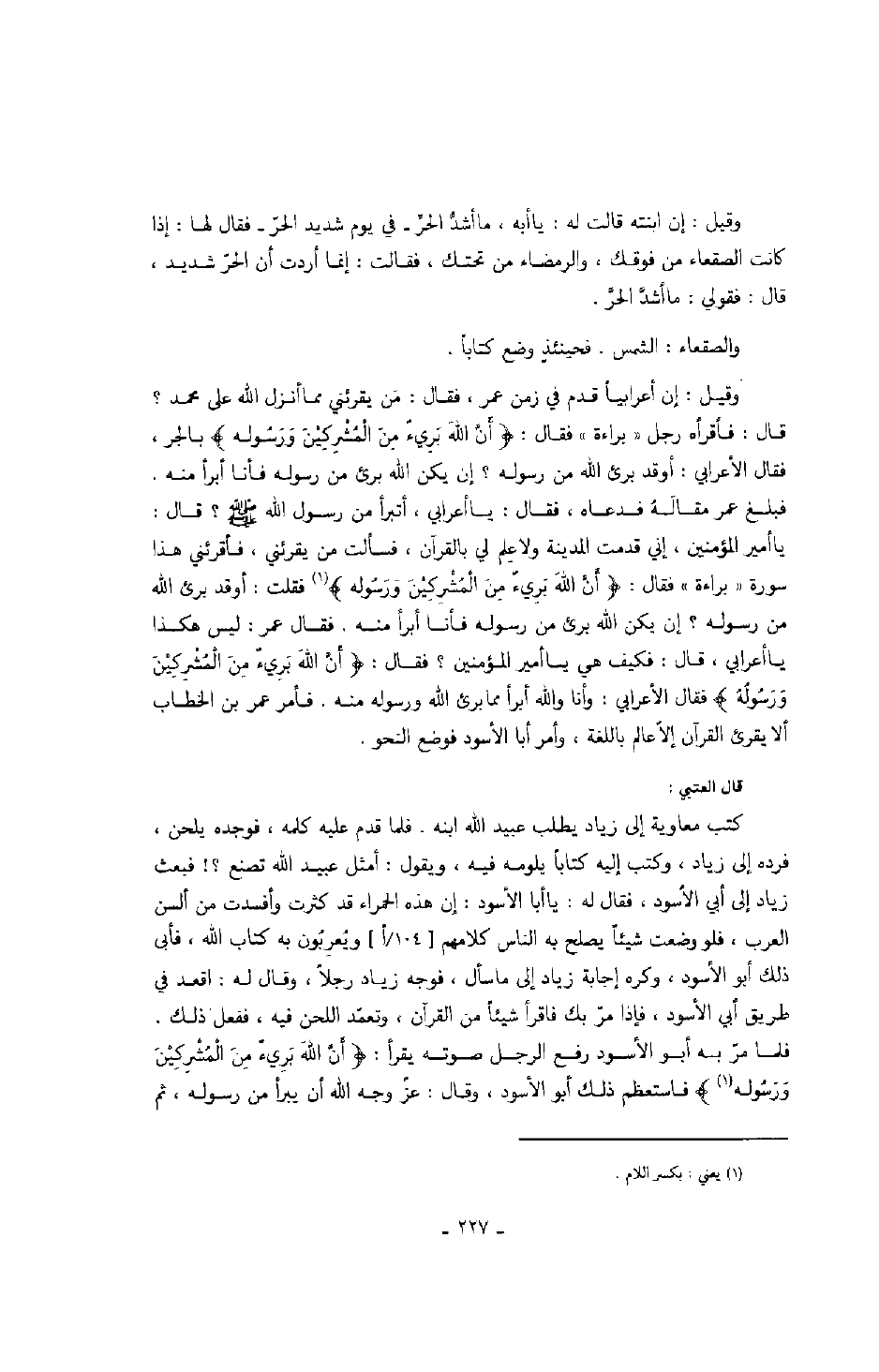 وقيل: إن أعرابياً قدم في زمن عمر، فقال: مَن يقرئني مما أنزل الله على محمد؟ قال: فأقرأه رجل " براءة " فقال: " أَنَّ اللهَ بَرِيءٌ مِنَ الْمُشْرِكِيْنَ وَرَسُوله " بالجر، فقال الأعرابي: أوقد برىء الله من رسوله؟ إن يكن الله برىء من رسوله فأنا أبرأ منه. فبلغ عمر مقالَهُ فدعاه، فقال: يا أعرابي، أتبرأ من رسول الله صَلَّى اللهُ عَلَيْهِ وَسَلَّمَ؟ قال: يا أمير المؤمنين، إني قدمت المدينة ولا عِلم لي بالقرآن، فسألت من يقرئني، فأقرئني هذا سورة " براءة " فقال: " أَنَّ اللهَ بَرِيءٌ مِنَ الْمُشْرِكِيْنَ وَرَسُوله " فقلت: أوقد برىء الله من رسوله؟ إن يكون الله برىء من رسوله، فأنا أبرأ منه. فقال عمر: ليس هكذا يا أعرابي، قال: فكيف هي يا أمير المؤمنين؟ فقال: " أَنَّ اللهَ بَرِيءٌ مِنَ الْمُشْرِكِيْنَ وَرَسُوله " فقال الأعرابي: وأنا والله أبرأ مما برىء الله ورسوله منه. فأمر عمر بن الخطاب ألا يقرىء القرآن إلاّ عالم باللغة، وأمر أبا الأسود فوضع النحو.
