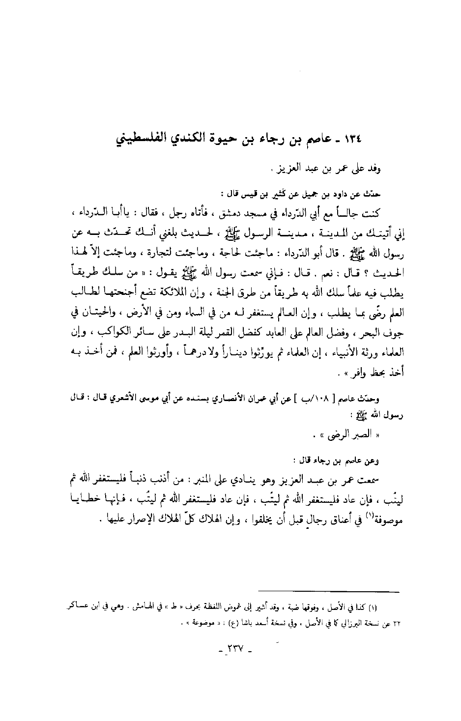 حدّث عن داود بن جميل عن كَثير بن قيس قال: كنت جالساً مع أبي الدّرداء في مسجد دمشق، فأتاه رجل، فقال: يا أبا الدّرداء، إني أتيتك من المدينة، مدينة الرسول صَلَّى اللهُ عَلَيْهِ وَسَلَّمَ، لحديث بلغني أنك تحدّث به عن رسول الله صَلَّى اللهُ عَلَيْهِ وَسَلَّمَ. قال أبو الدّرداء: ما جئت لحاجة، وما جئت لتجارة، وما جئت إلاّ لهذا الحديث؟ قال: نعم. قال: فني سمعت رسول الله صَلَّى اللهُ عَلَيْهِ وَسَلَّمَ يقول: " من سلك طريقاً يطلب فيه علماً سلك الله به طريقاً من طرق الجنة، وإن الملائكة تضع أجنحتها لطالب العلم رضى بما يطلب، وإن العالم يستغفر له من في السماء ومن في الأرض، والحيتان في جوف البحر، وفضل العالم على العابد كفضل القمر ليلة البدر على سائر الكواكب، وإن العلماء ورثة الأنبياء، إن العلماء ثم يورِّثوا ديناراً ولا درهماً، وأورثوا العلم، فمن أخذ به أخذ بخط وافر ".